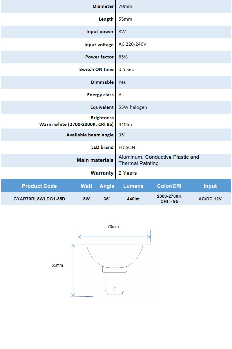 The Atmosphere AR70-8W is a LED lighting source which has a dim to warm chip built in it. It is same as halogen and can also compatible with many dimmer in the market.