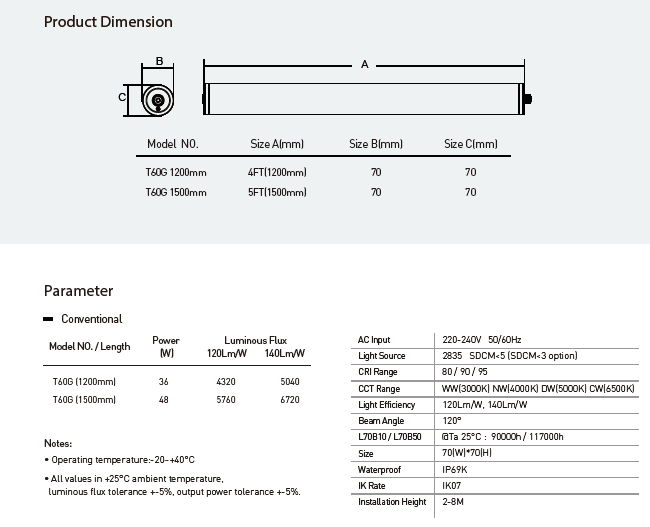 The T60G tubular luminaire is tempered glass material designed and therefore an ideal lighting solution for a wide variety of