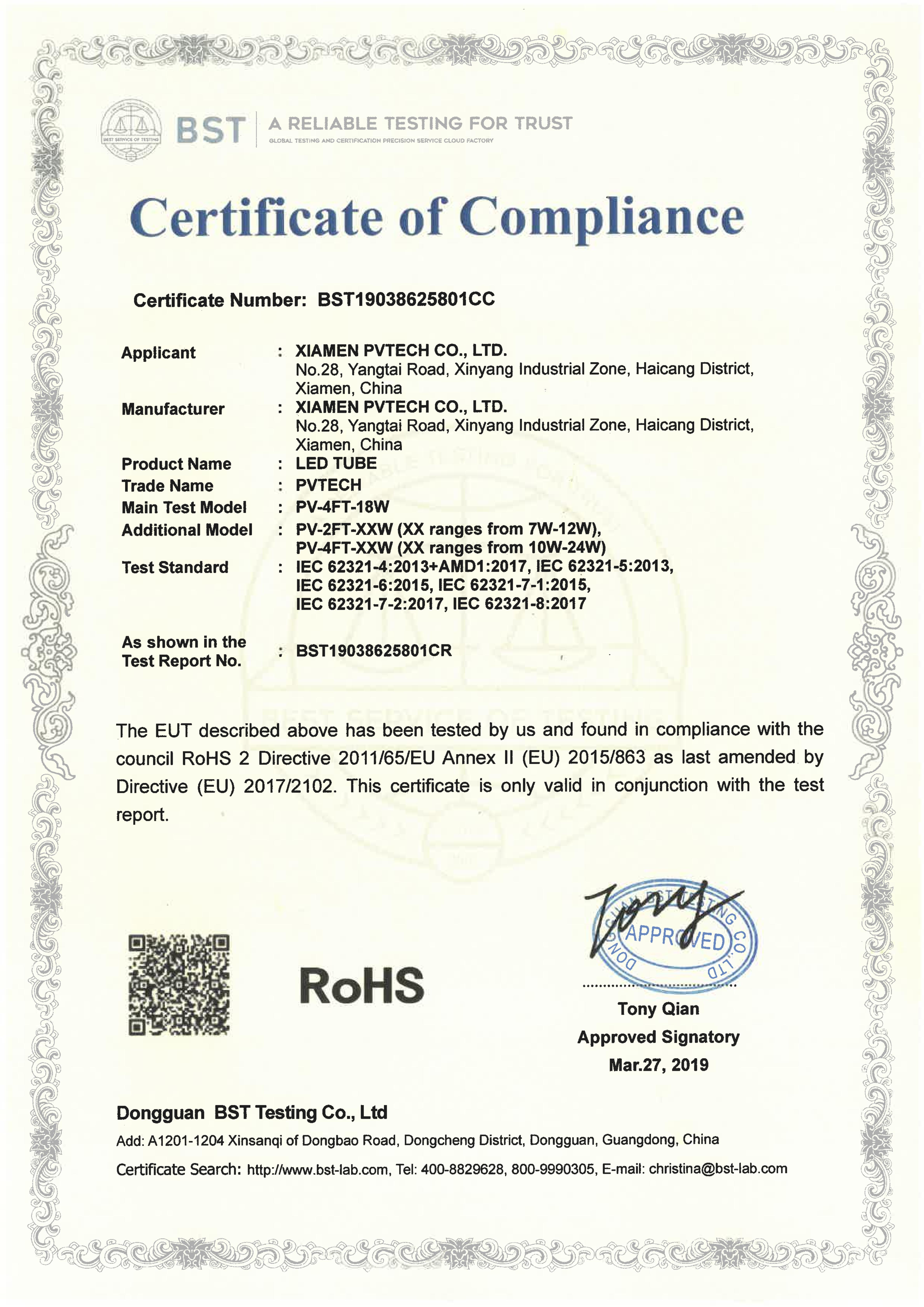 发行机构Dongguan BST Testing Co., Ltd证书类型-有效日期(不適用) - (不適用)