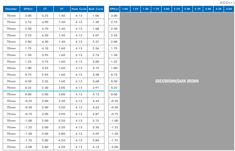 SPH: -2.00~+3.00/ADD 0~+3.50