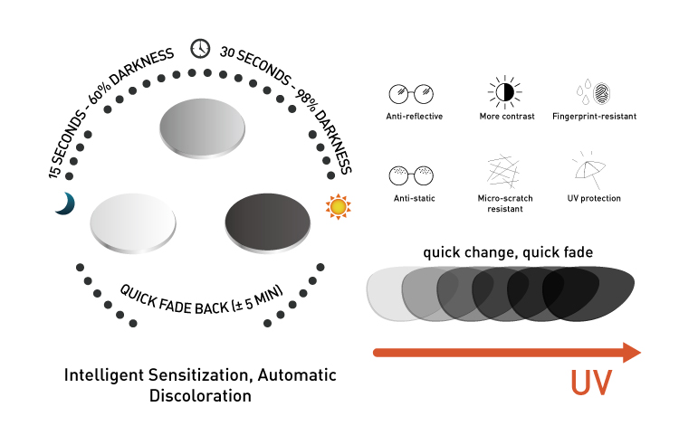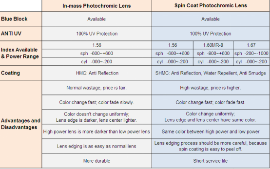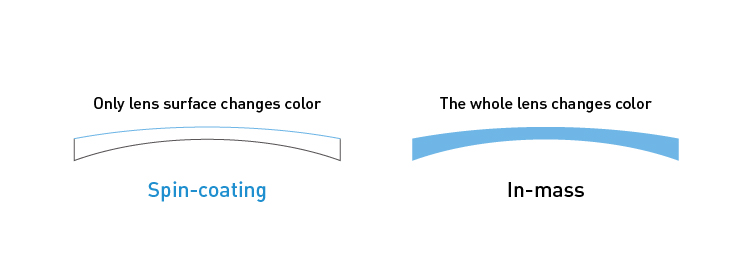 Spin-coating technology makes the photochromic coating on the surface of lens, so color only changes on lenses surface, while in-mass technology make the whole lens change color.