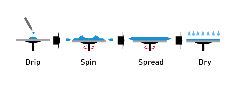 Spin coating technique is used for making a thin coating on relatively flat substrates. The solution of material to be coated is deposited onto the substrate which is spun off at a high velocity in a range of 1000-8000 rpm and leaving a uniform layer.