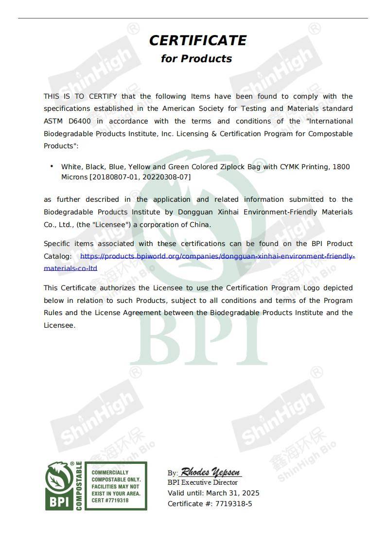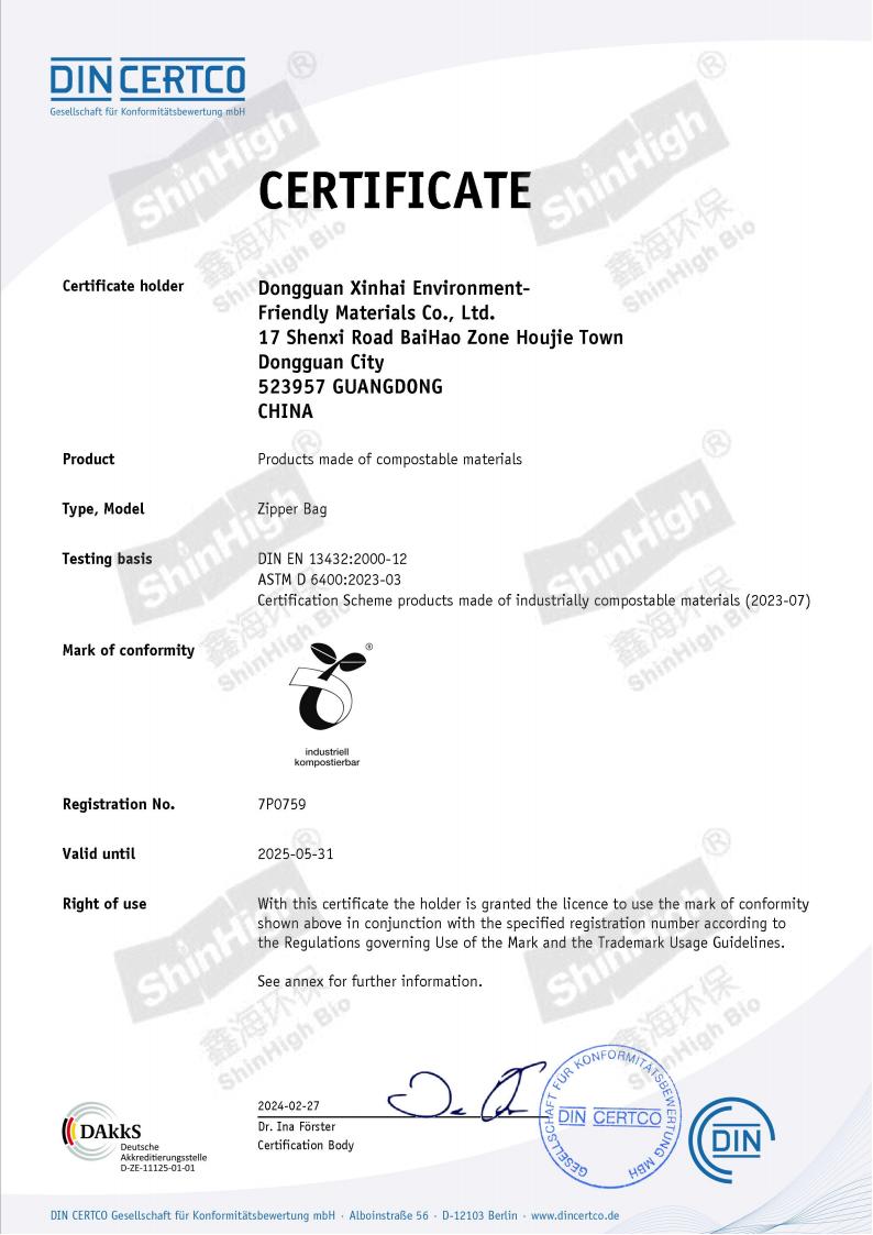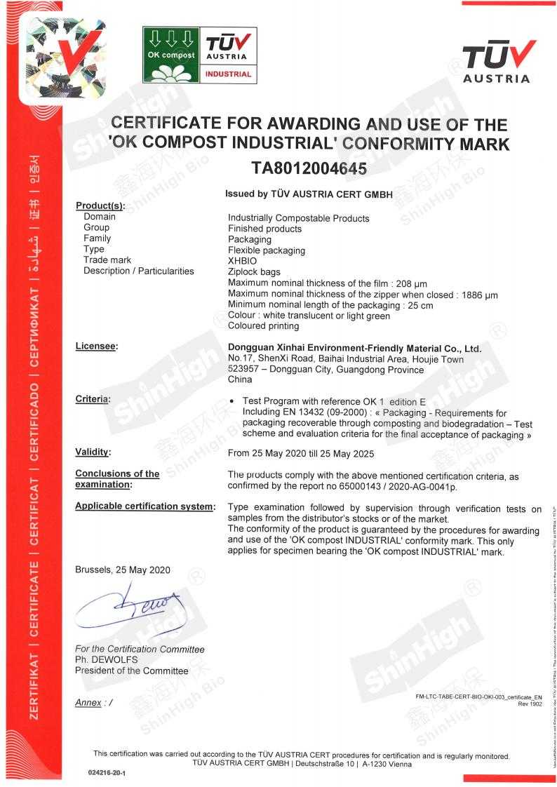 TUV OK compost, BPI ASTM D6400, AS 4736, EN 13432, FDA.