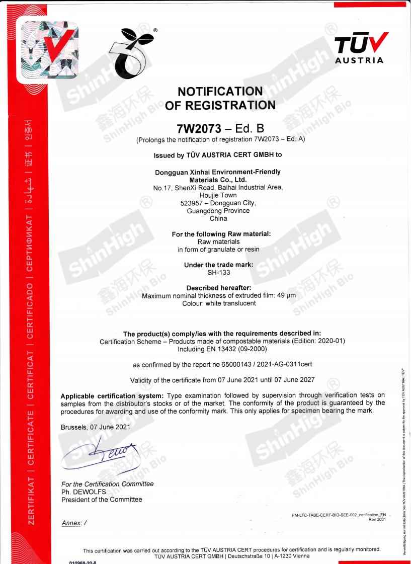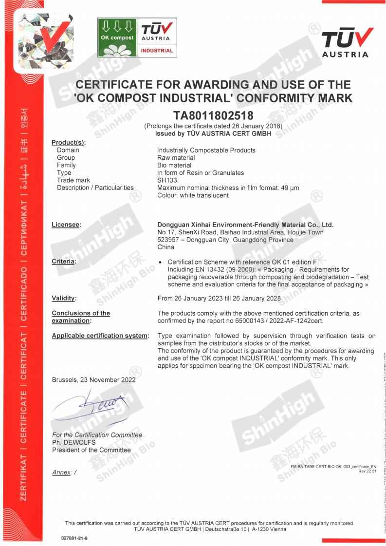 TUV OK compost, BPI ASTM D6400, EN 13432.