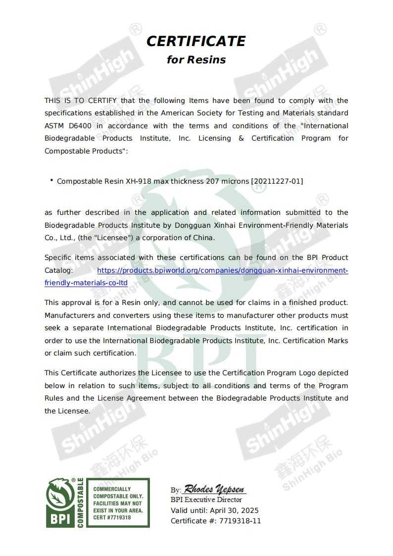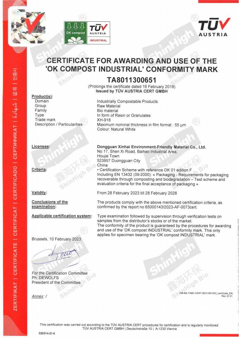 TUV OK compost, BPI ASTM D6400, EN 13432.
