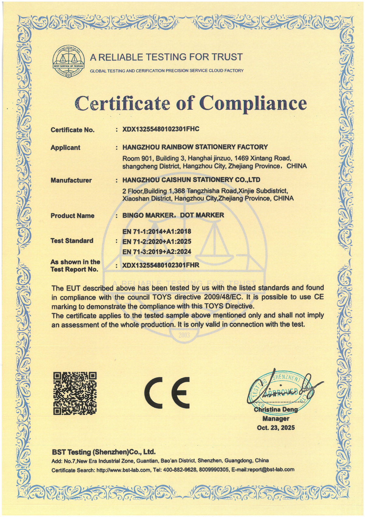 Hangzhou Caishun Stationery Co,Ltd was foundedin 2018,is a government-registered industry andtrade integrated enterprise, specializing inmanufacture children's educational toys, paintingtoys, arts and crafts supplies, dot-doodle pens, bingomarkers, invisible pens, gift highlighters, markers,ballpoint pens and other stationery; we owns quitenumber of product patents.