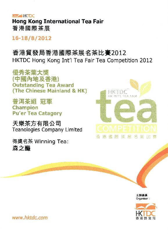 2012 HK tea fair - Champion; 2013 HK tea fair - the 1st runner up