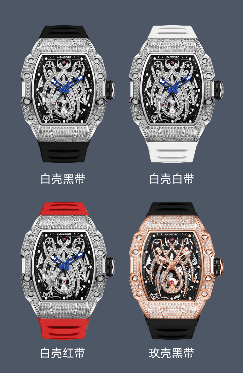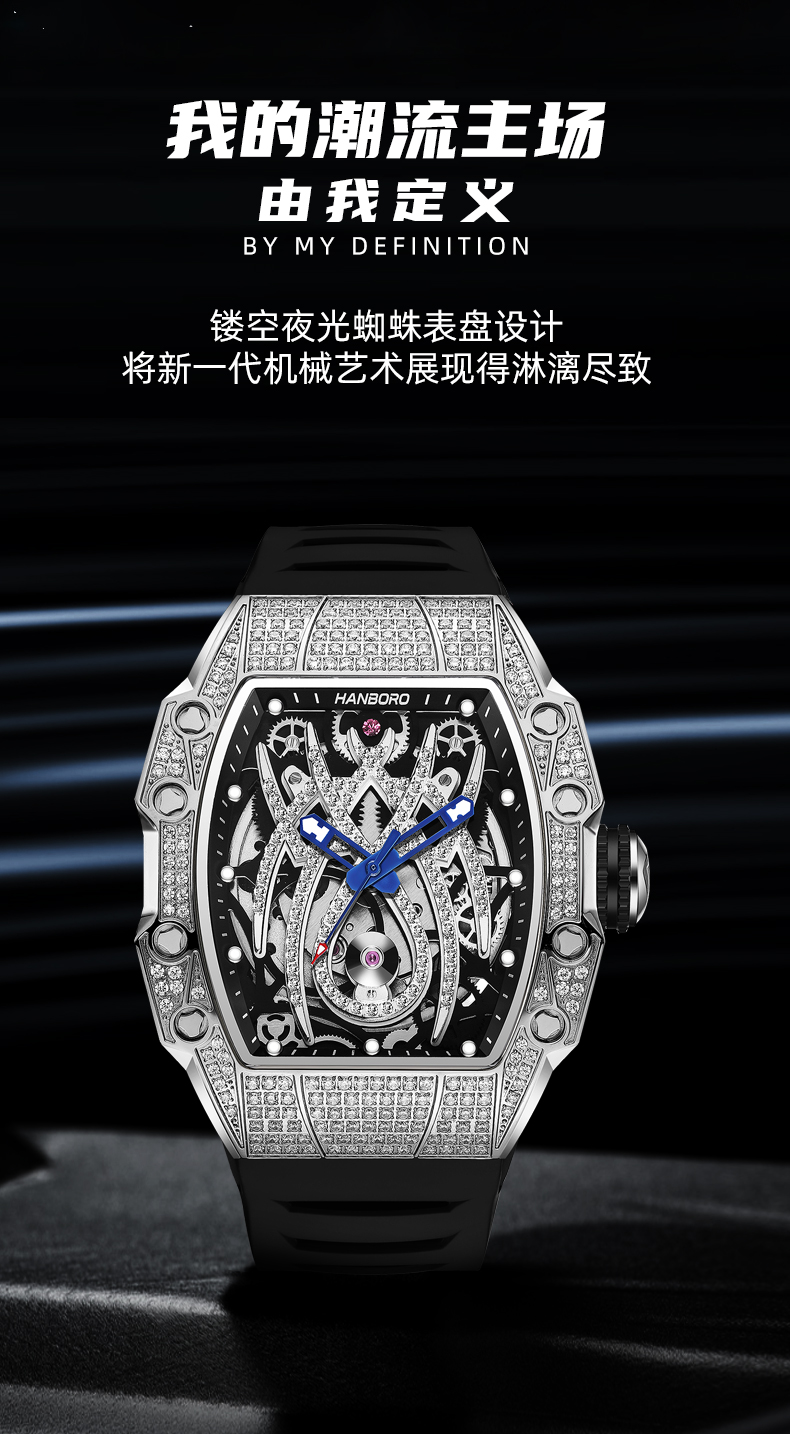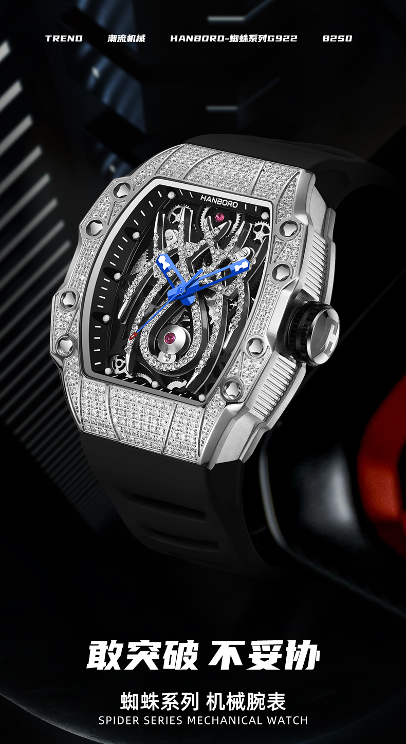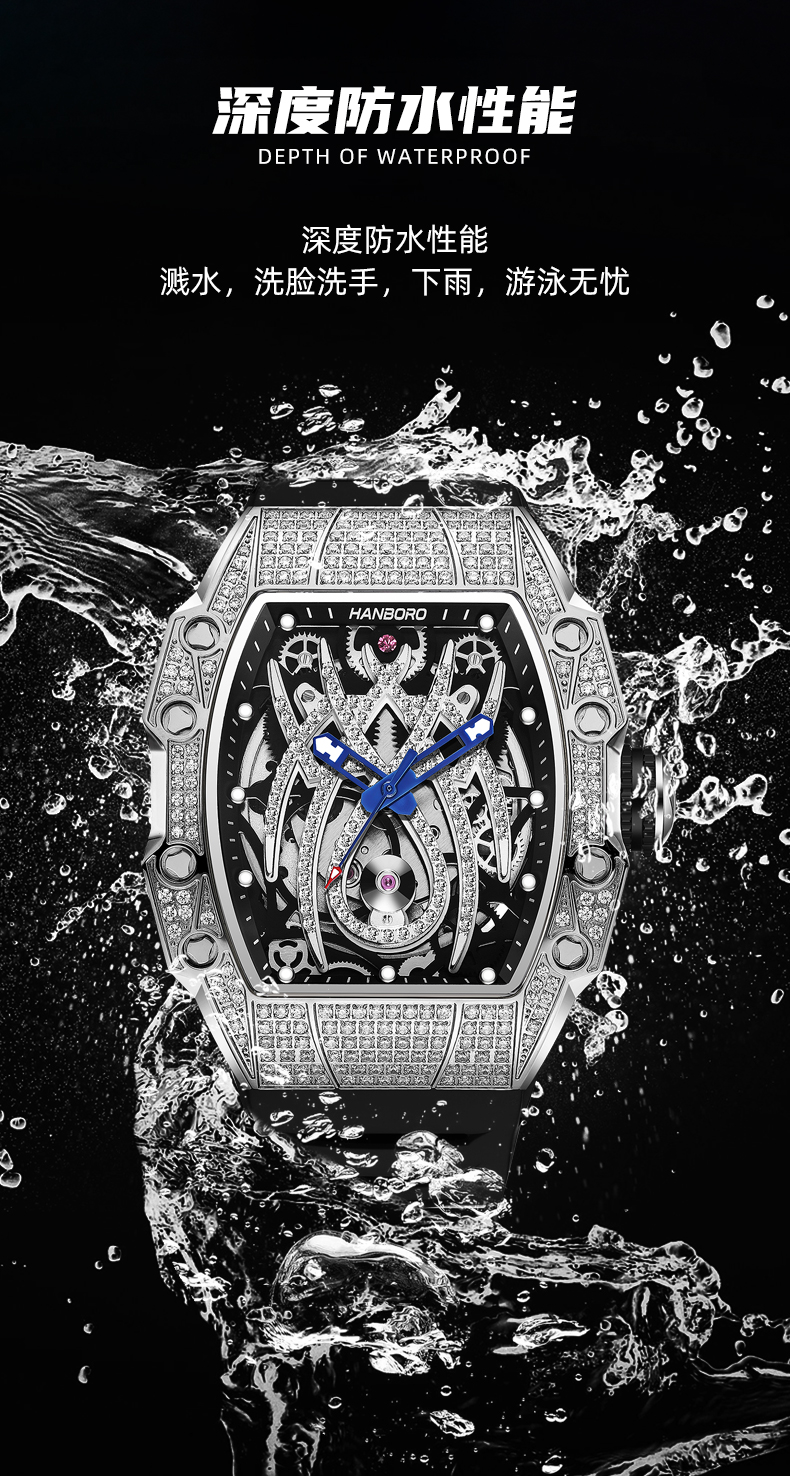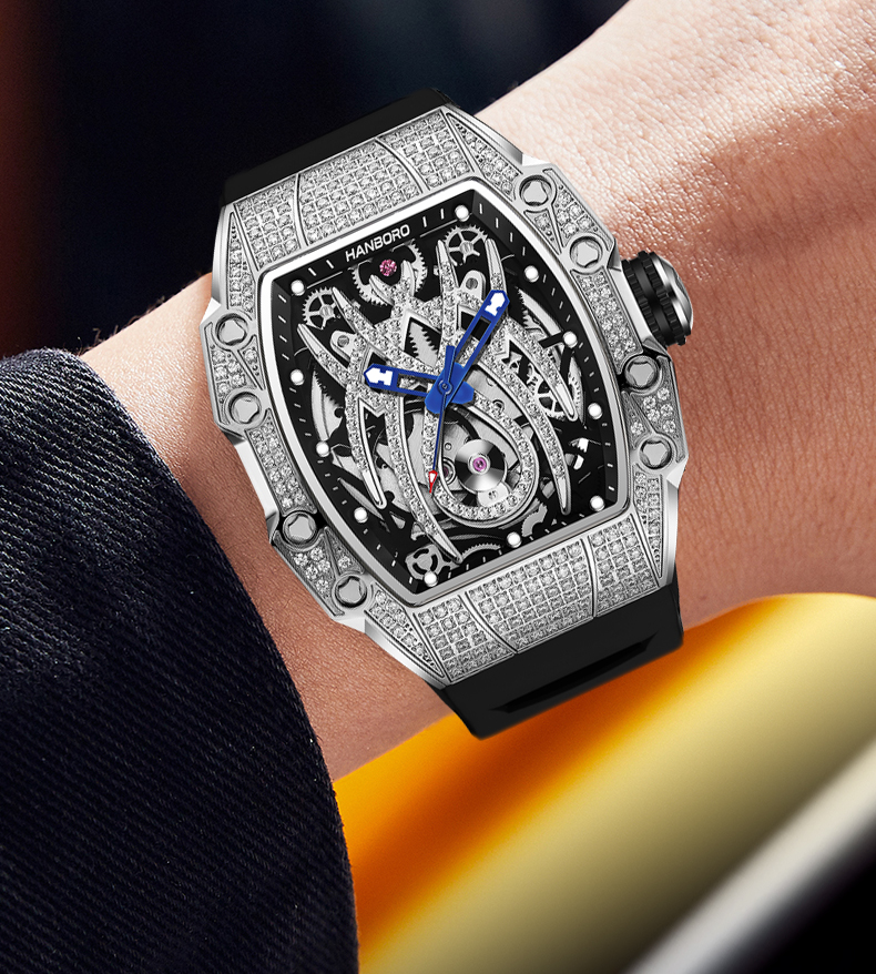 HANBORO tonneau-shaped men's automatic skeleton mechanical watch waterproof luminous wristwatch 922-2