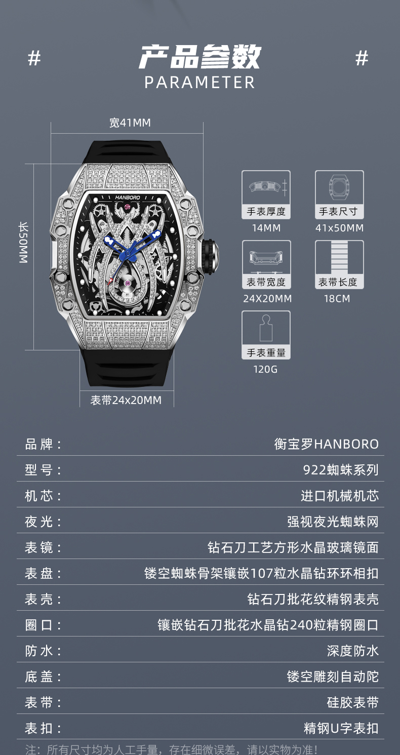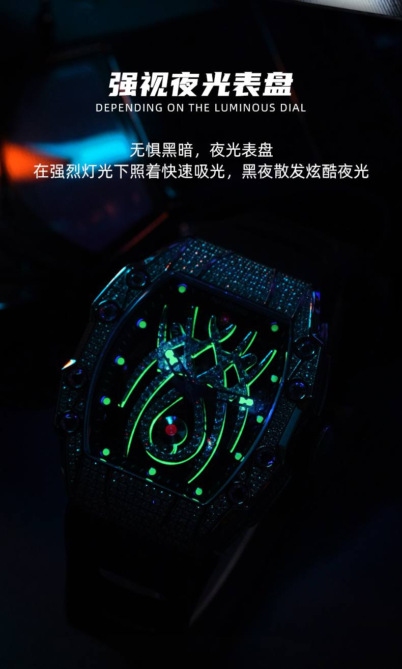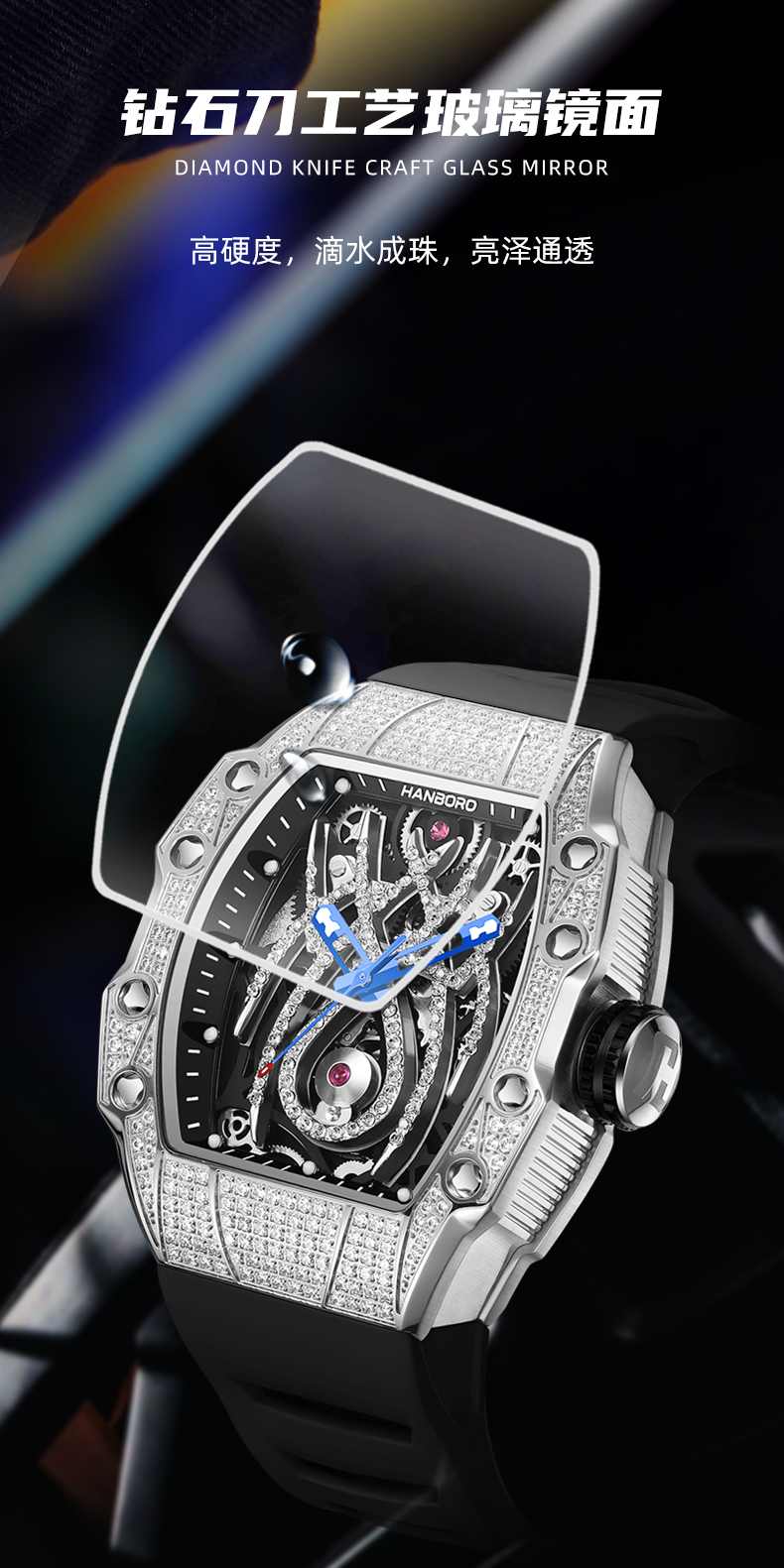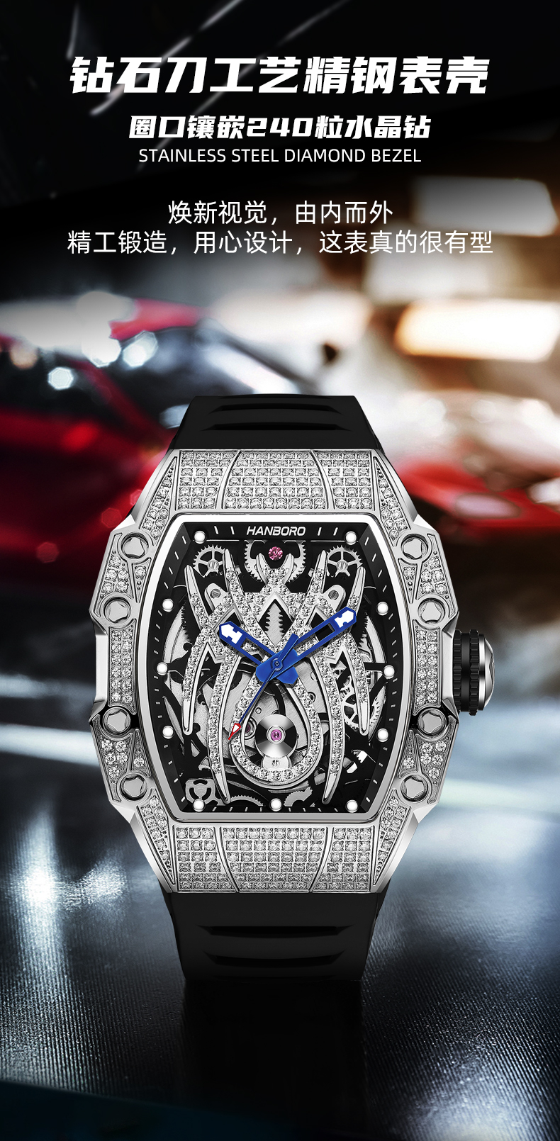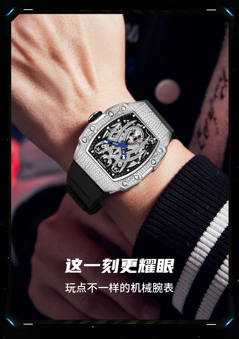HANBORO tonneau-shaped men's automatic skeleton mechanical watch waterproof luminous wristwatch 922-2