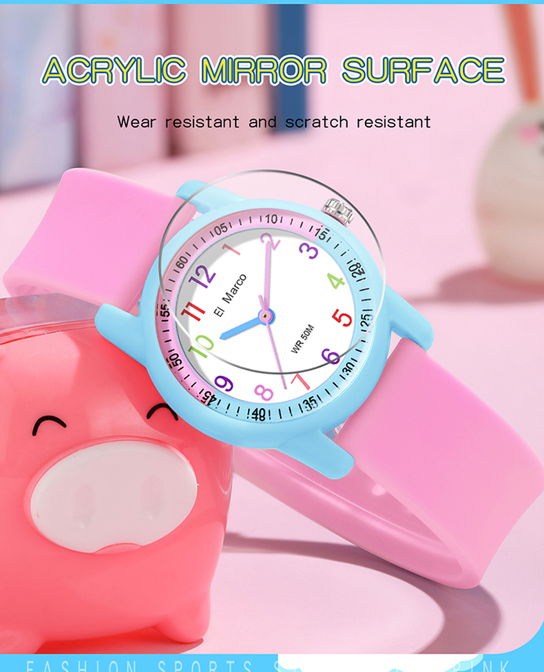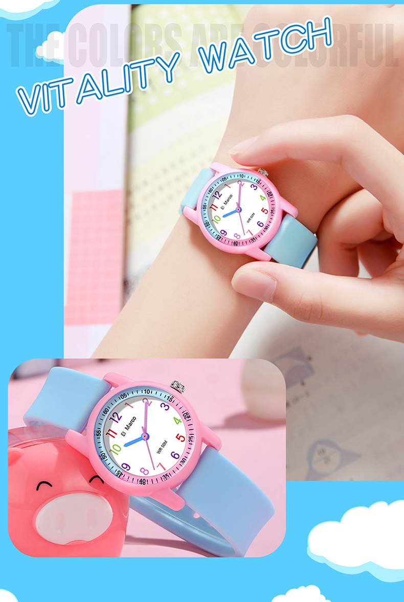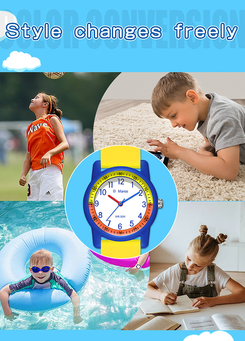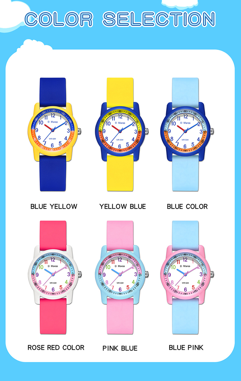 EI Marco/ Elephant Kyle is a simple quartz watch for students, which has a variety of color collisions, giving it a new interpretation and creating a lovely style of youthful vitality, making it a casual quartz watch. It has 5ATM waterproof performance, which can meet the waterproof needs of daily life. The case is made of ABS material, which is shock-proof and fall-proof, which can protect the movement from damage, and it is a multi-color collision design, giving a brand-new design style. The strap is a soft strap of TPU, which is light and comfortable and has no feeling of wearing. The bottom cover is made of stainless steel, which is waterproof every day and not easy to rust, which increases the durability of the watch. The dial is simple, clear digital scale, fashionable, beautiful and easy to read. Style changes at will. This watch has a variety of colors to choose from: blue band with yellow shell, yellow band with deep blue shell, blue band with deep blue shell, rose red, pink band with blue shell, blue band with pink shell, etc. It is both fashionable and practical, and is an excellent choice for children to wear, develop a reasonable biological clock and cultivate a correct concept of time。