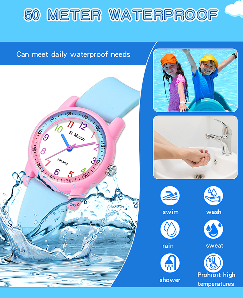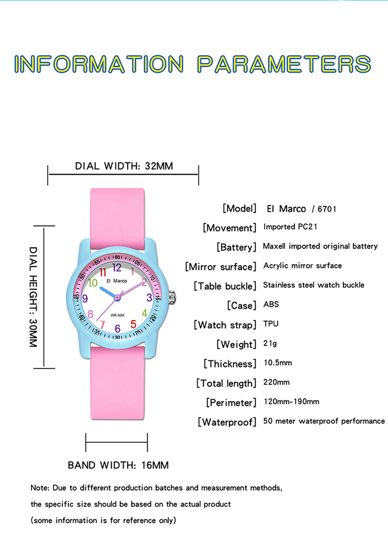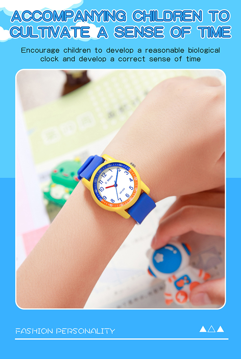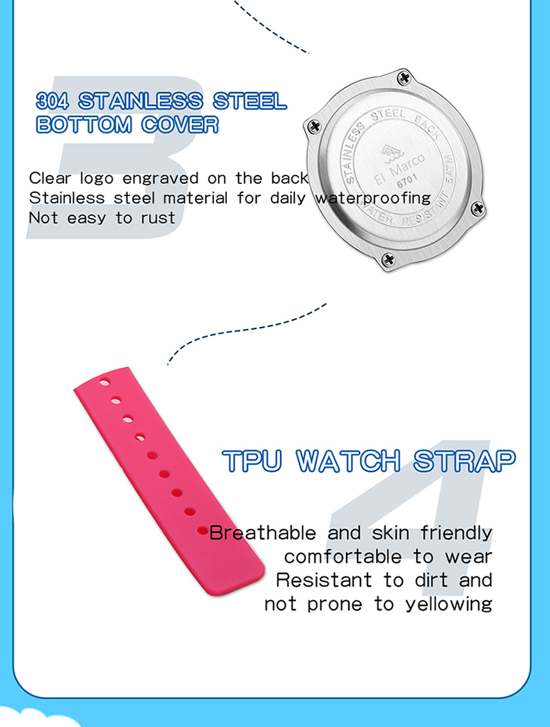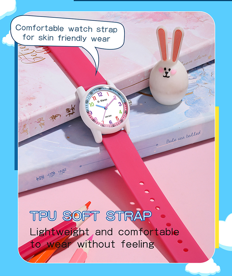 EI Marco/ Elephant Kyle is a simple quartz watch for students, which has a variety of color collisions, giving it a new interpretation and creating a lovely style of youthful vitality, making it a casual quartz watch. It has 5ATM waterproof performance, which can meet the waterproof needs of daily life. The case is made of ABS material, which is shock-proof and fall-proof, which can protect the movement from damage, and it is a multi-color collision design, giving a brand-new design style. The strap is a soft strap of TPU, which is light and comfortable and has no feeling of wearing. The bottom cover is made of stainless steel, which is waterproof every day and not easy to rust, which increases the durability of the watch. The dial is simple, clear digital scale, fashionable, beautiful and easy to read. Style changes at will. This watch has a variety of colors to choose from: blue band with yellow shell, yellow band with deep blue shell, blue band with deep blue shell, rose red, pink band with blue shell, blue band with pink shell, etc. It is both fashionable and practical, and is an excellent choice for children to wear, develop a reasonable biological clock and cultivate a correct concept of time。