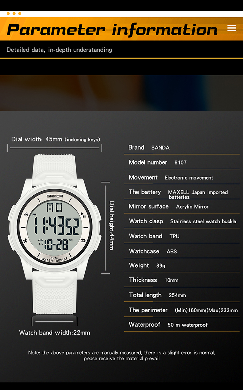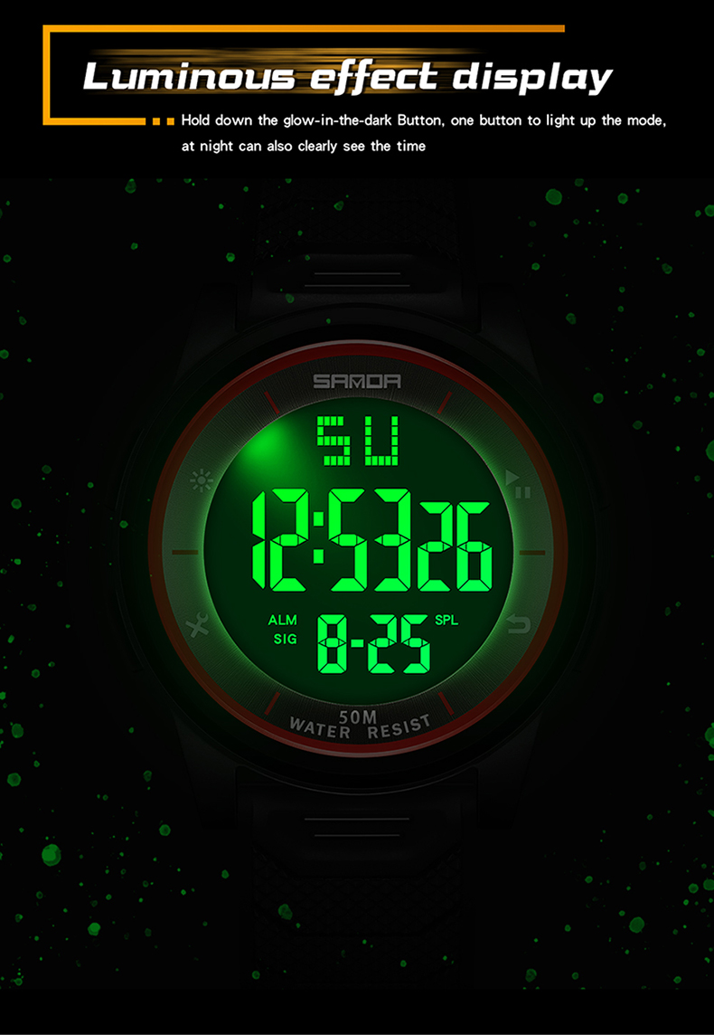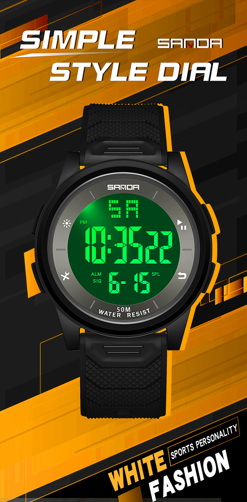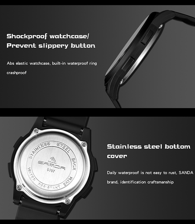 Sanda 6107 Fashion Single Display Multifunctional Large Dial Electronic Watch Alarm clock, hour strike, day of the week, stopwatch timing, 12/24 hour mode! 50M waterproof life, no fear of splash, free to play! Turn on the night light with one button, and display it on the big screen, which will make it clearer at night! TPU strap, not easy to deform, easy to clean! Stainless steel with bottom cover, daily waterproof, not easy to rust! Both boys and girls can wear it!