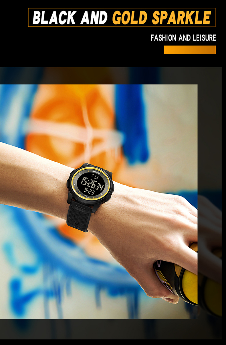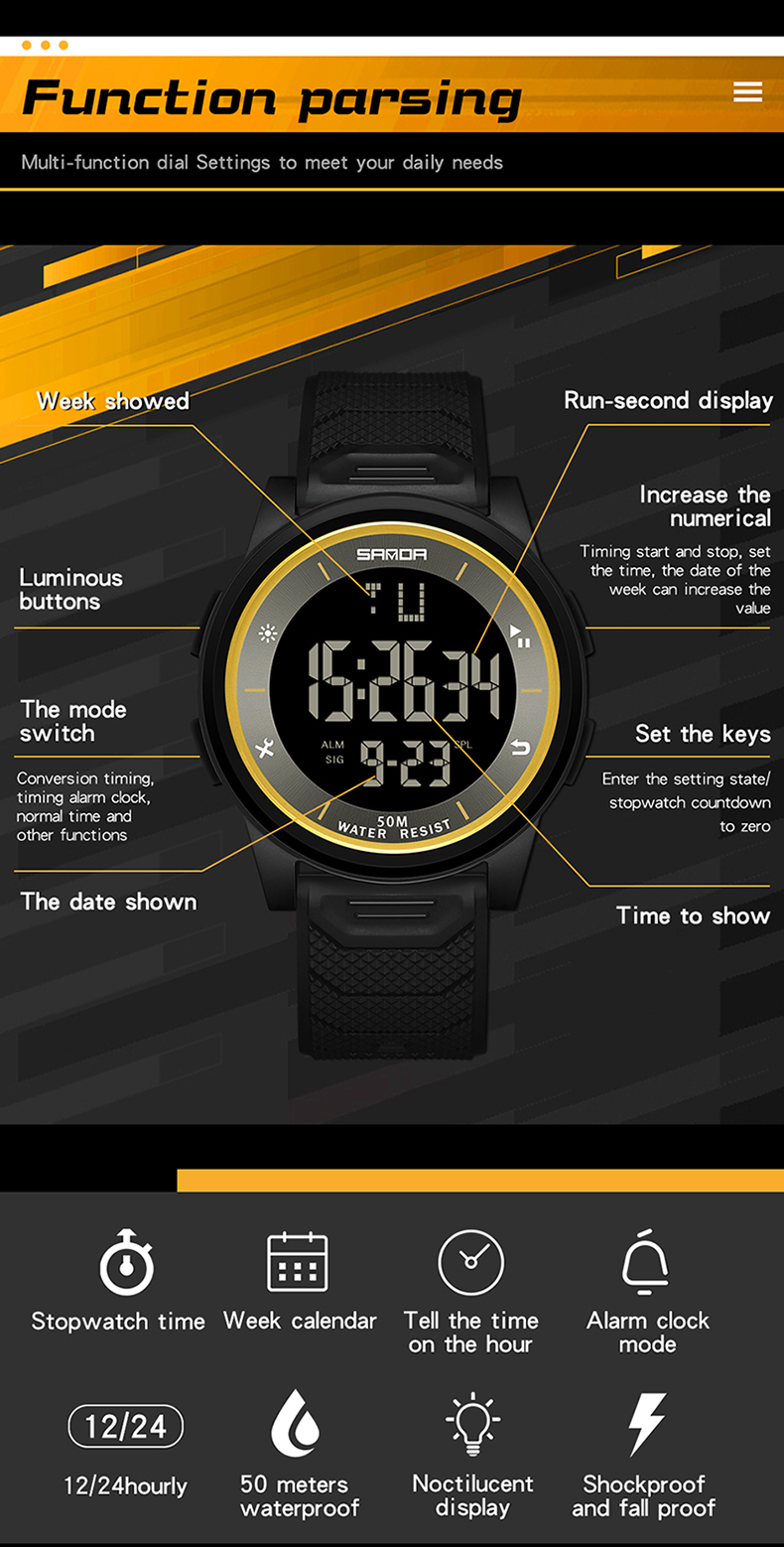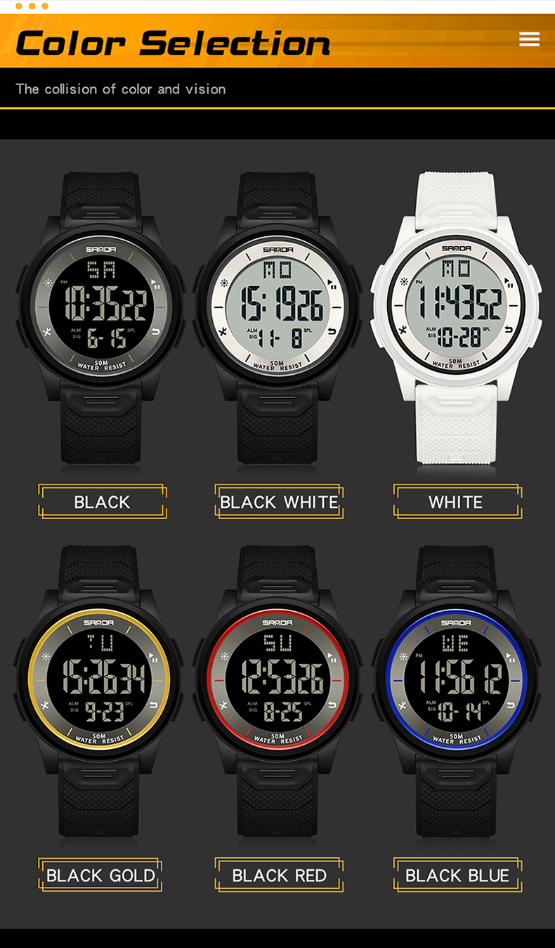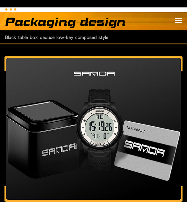 Sanda 6107 Fashion Single Display Multifunctional Large Dial Electronic Watch Alarm clock, hour strike, day of the week, stopwatch timing, 12/24 hour mode! 50M waterproof life, no fear of splash, free to play! Turn on the night light with one button, and display it on the big screen, which will make it clearer at night! TPU strap, not easy to deform, easy to clean! Stainless steel with bottom cover, daily waterproof, not easy to rust! Both boys and girls can wear it!
