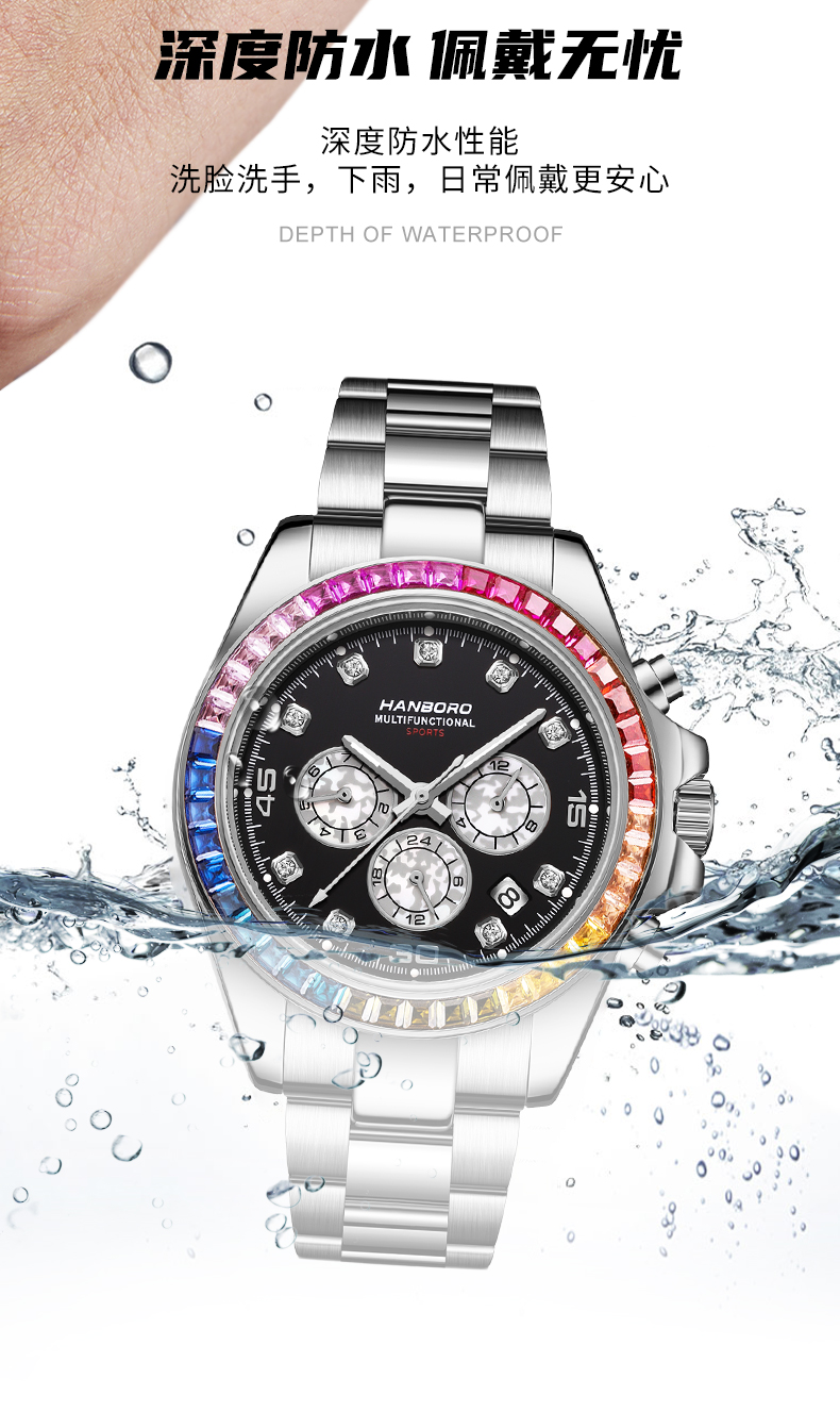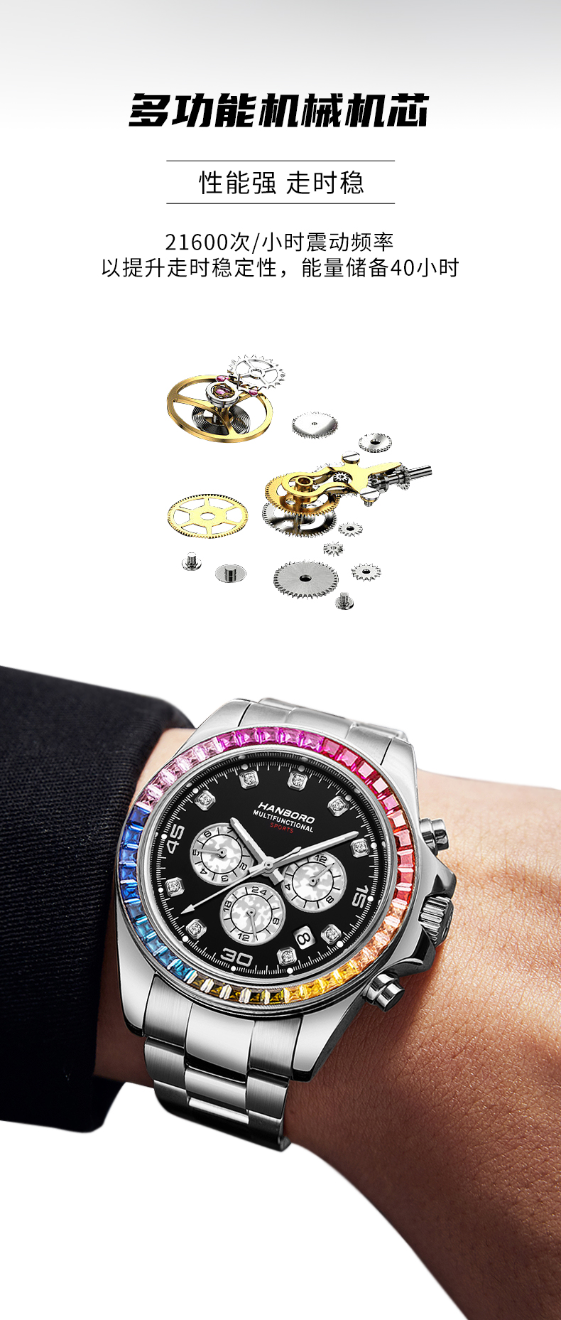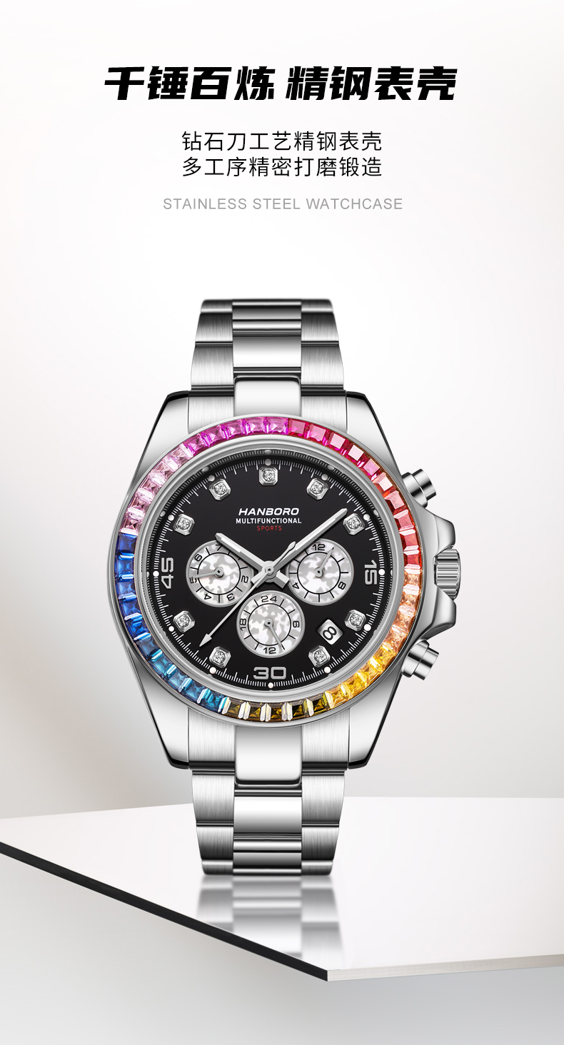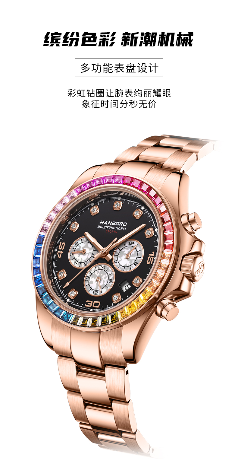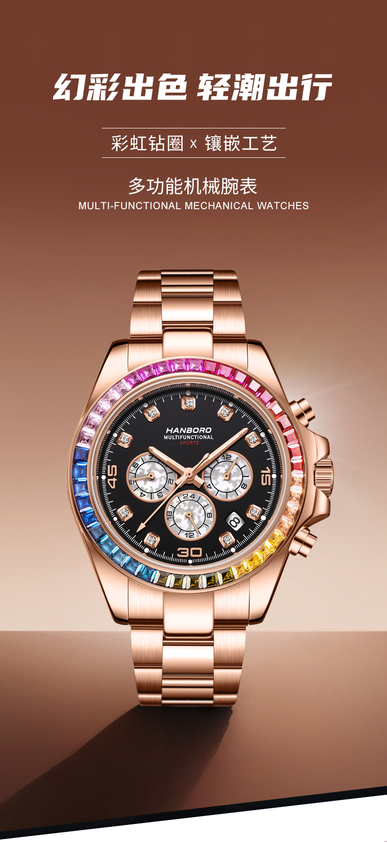 HANBORO Rainbow Dee Multifunction Automatic Mechanical Watch Men's Waterproof Steel Strap Wristwatch 8032L