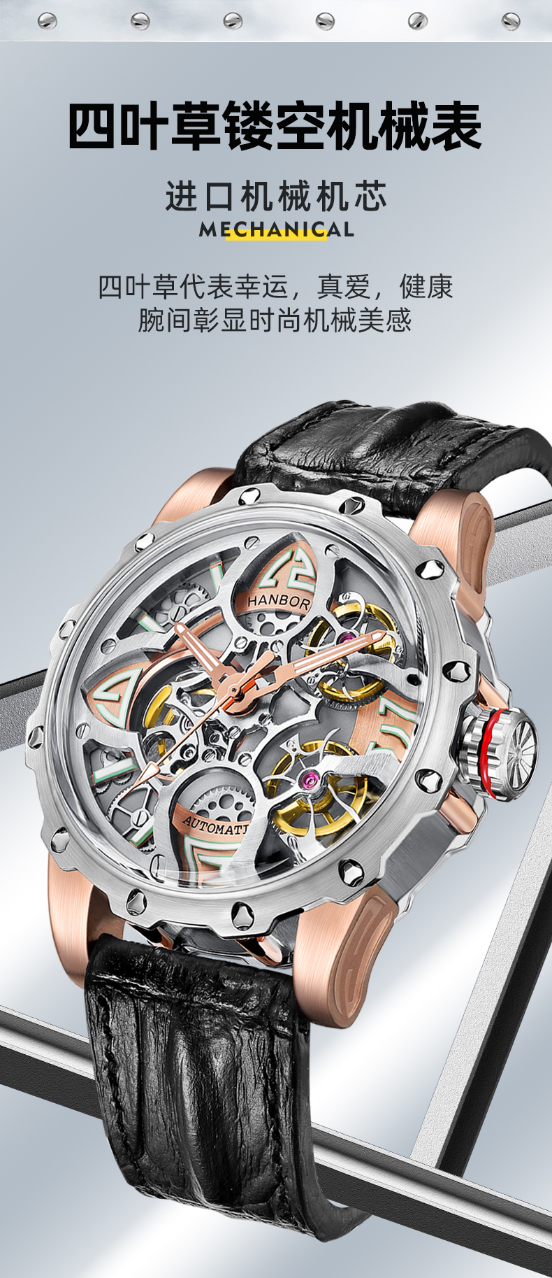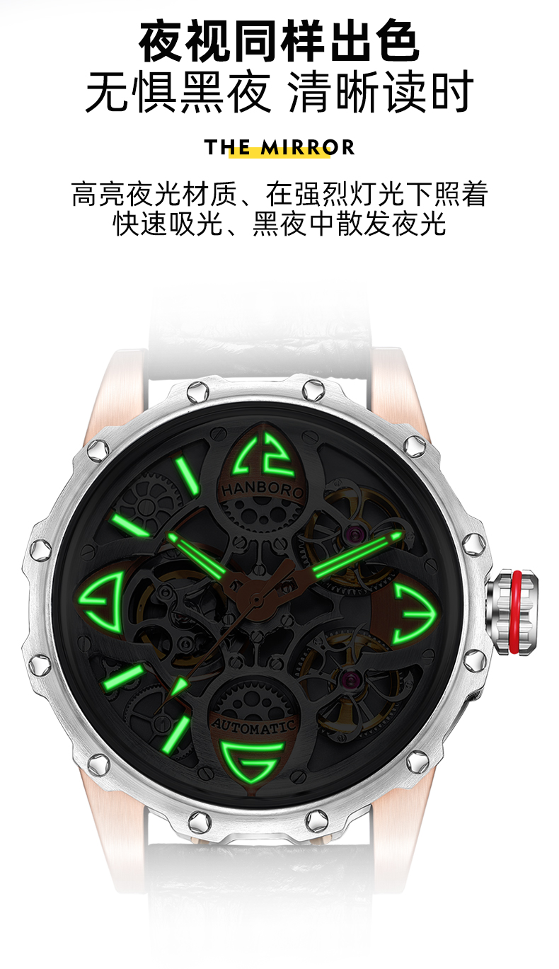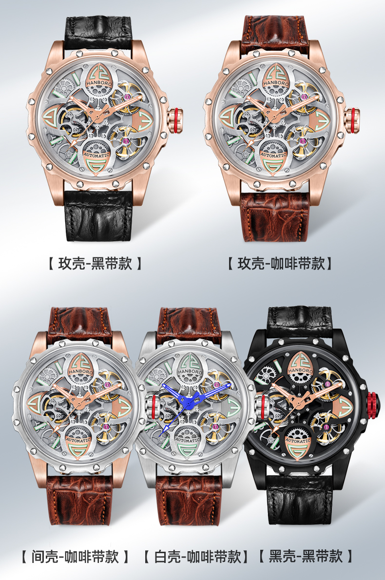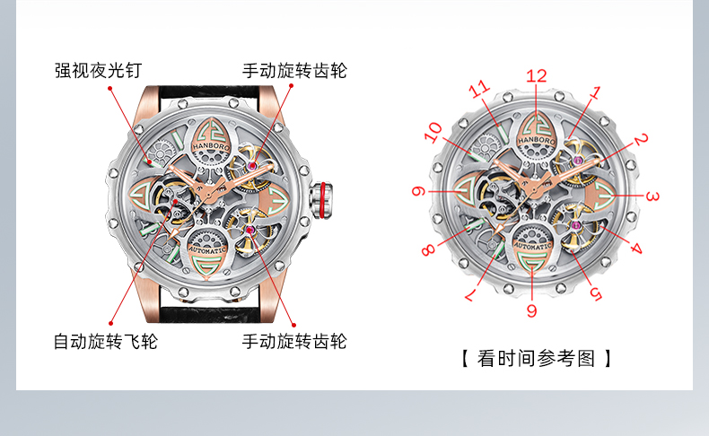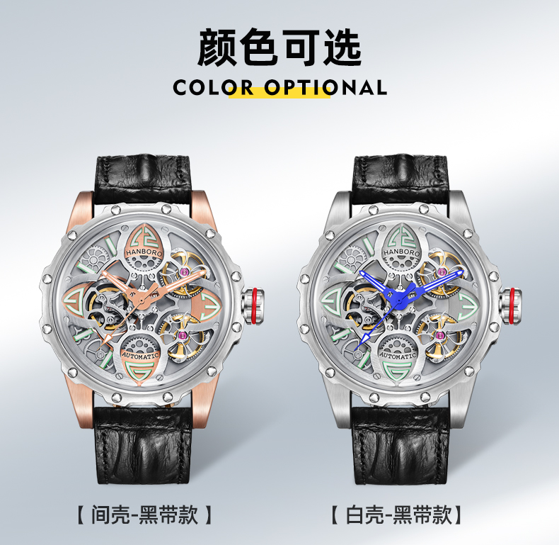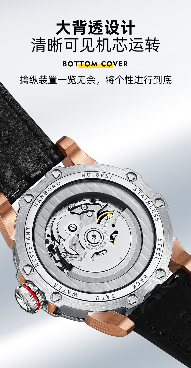 HANBORO Clover King Series Men's Automatic Skeleton Mechanical Watch Wristwatch Fashion Large Dial Watch 8851
