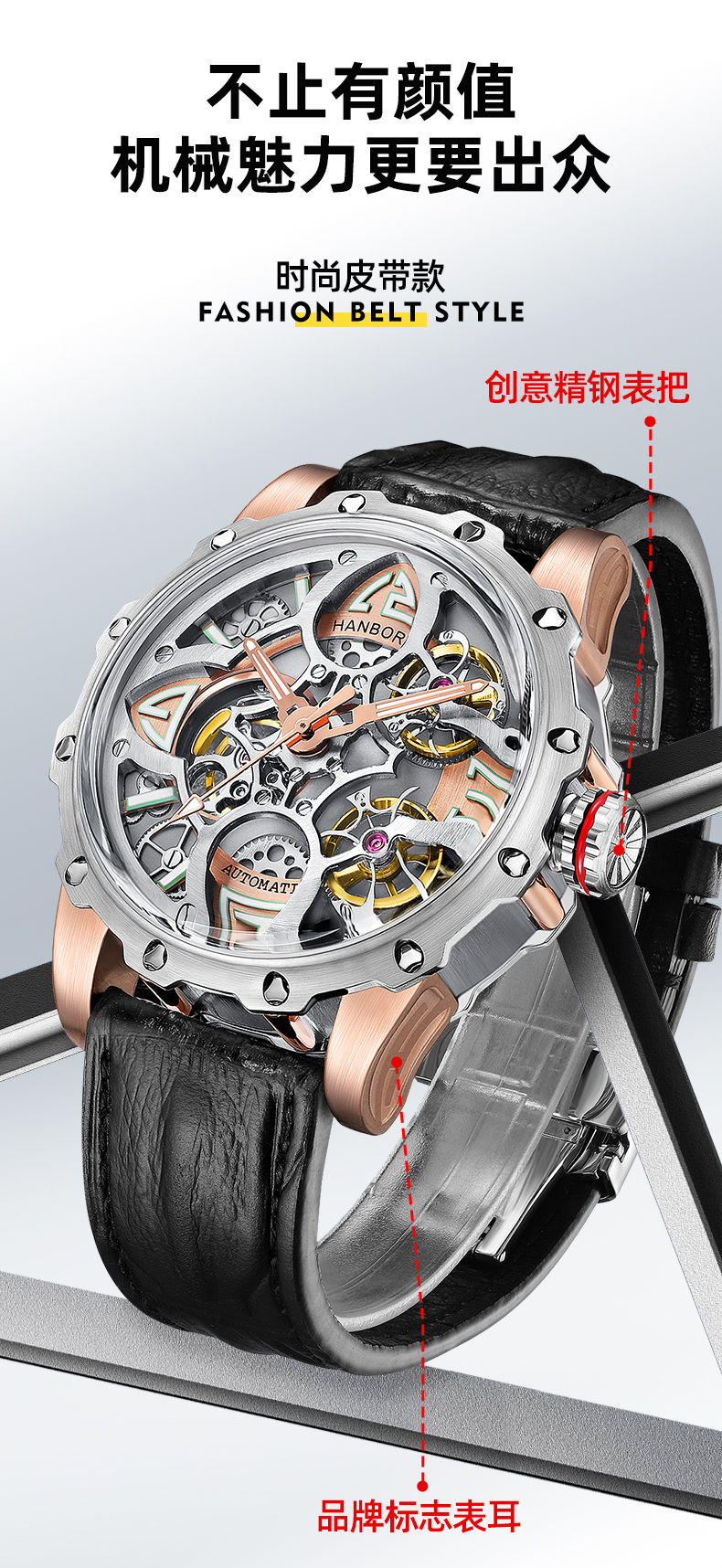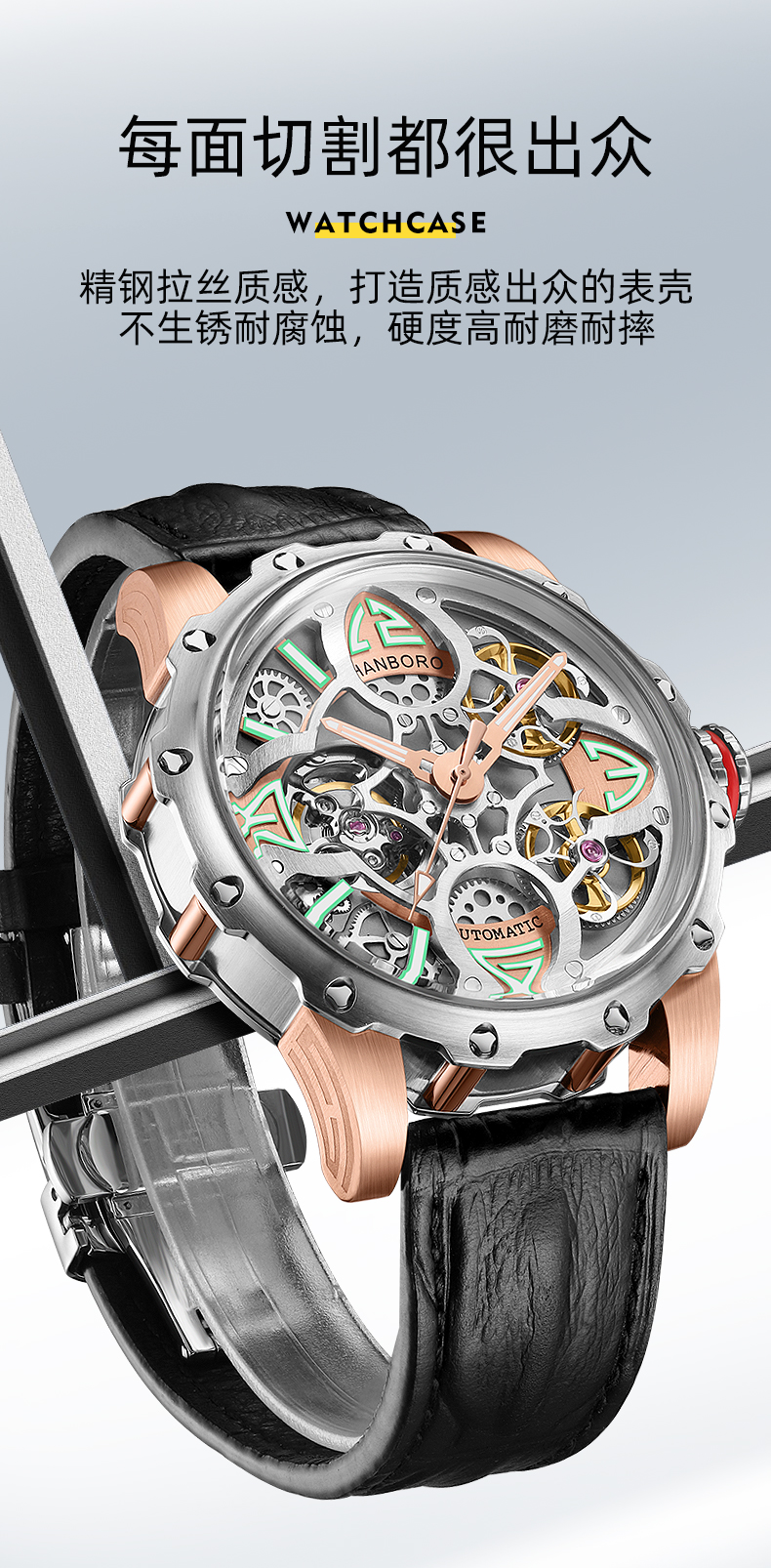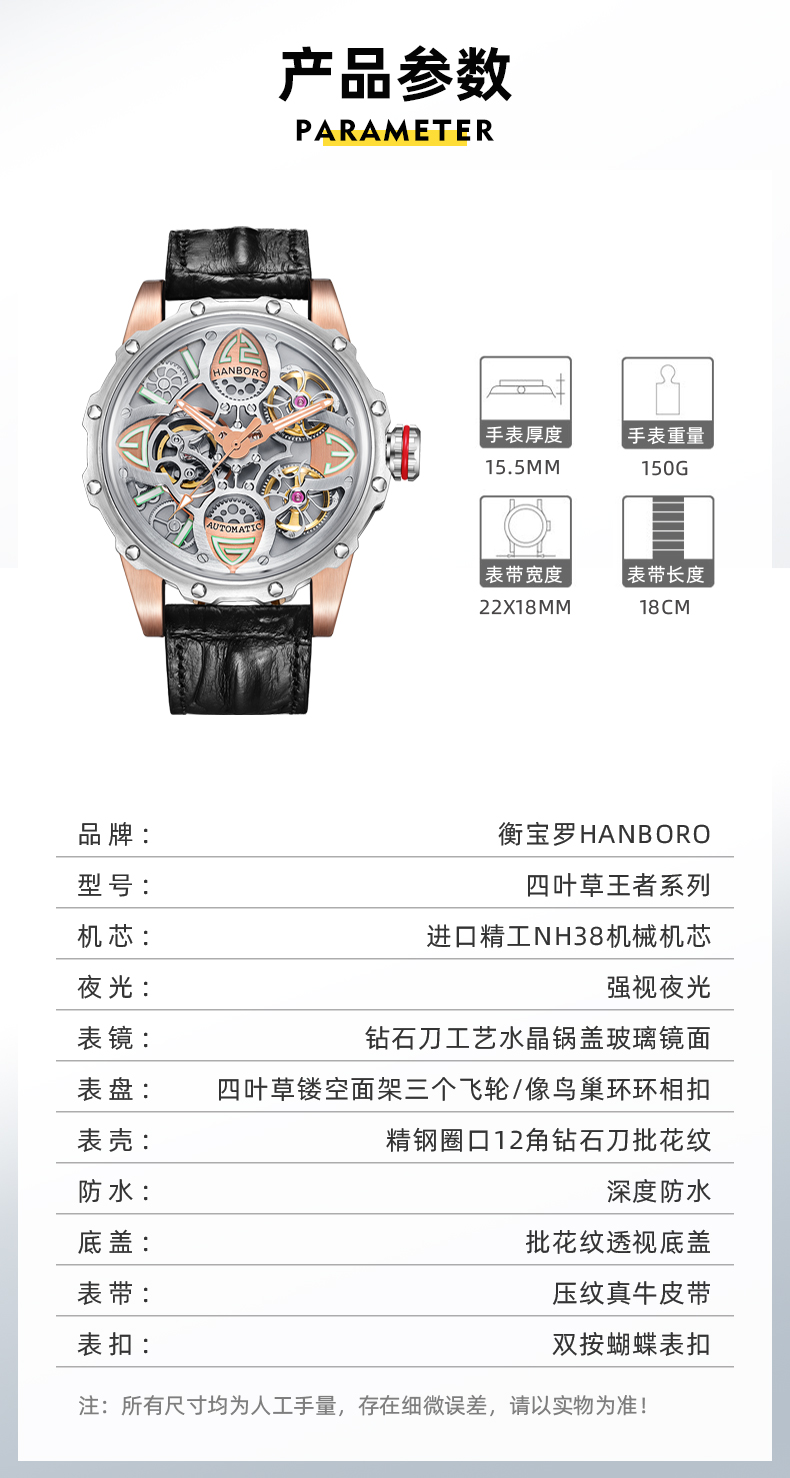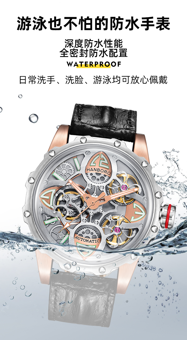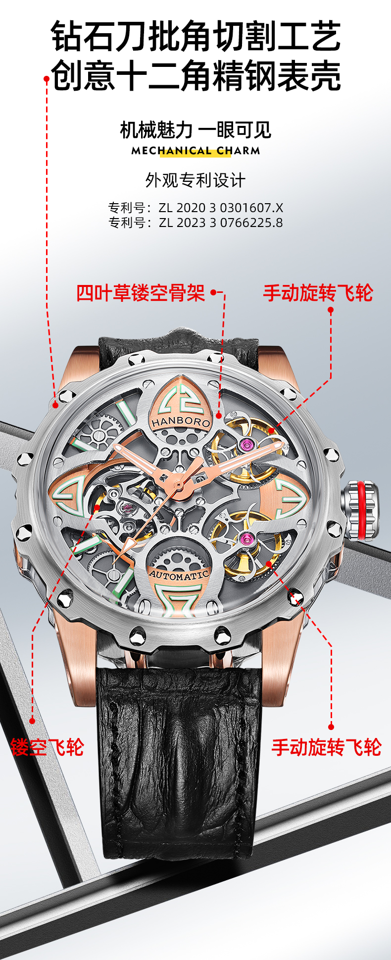 HANBORO Clover King Series Men's Automatic Skeleton Mechanical Watch Wristwatch Fashion Large Dial Watch 8851