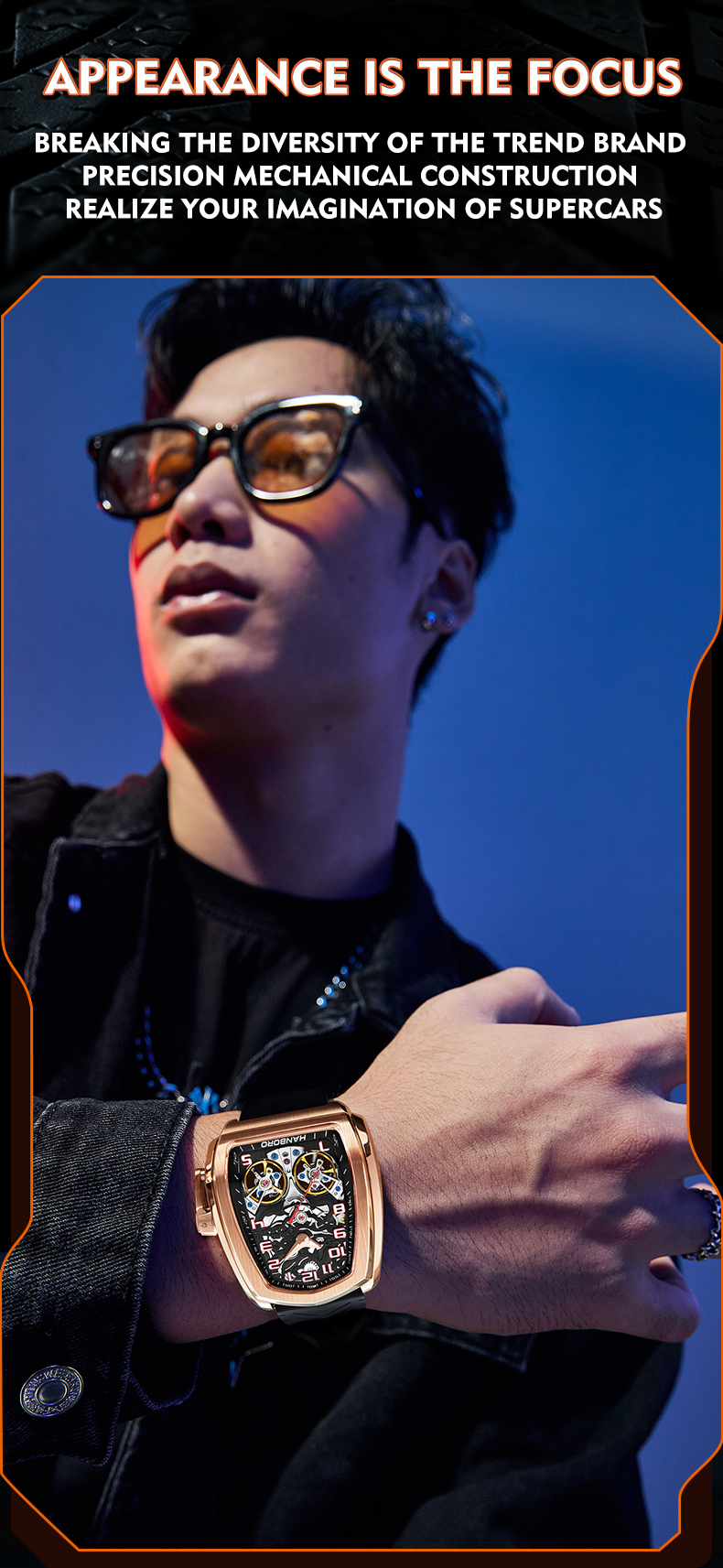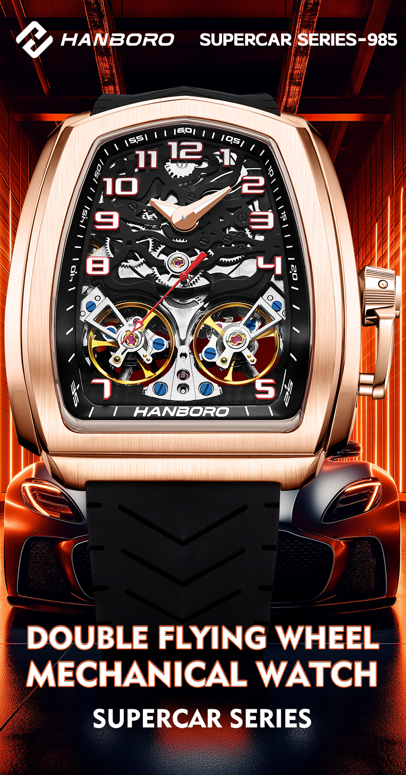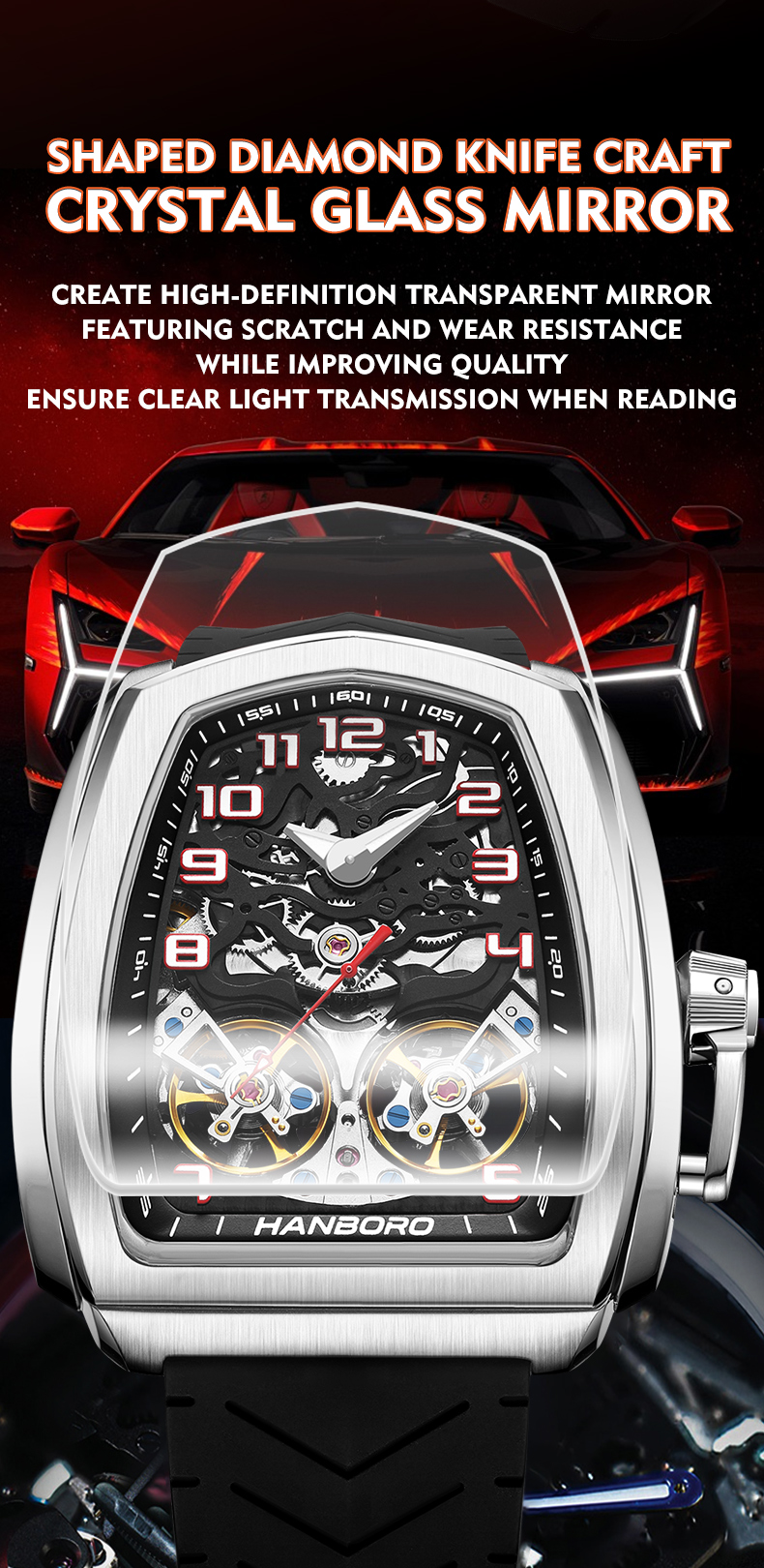 HANBOROSSR Supercar Series Double Tourbillon Hollow Fully Automatic Square Mechanical Watch Waterproof Luminous Silicon Tape Men's Watch 985
