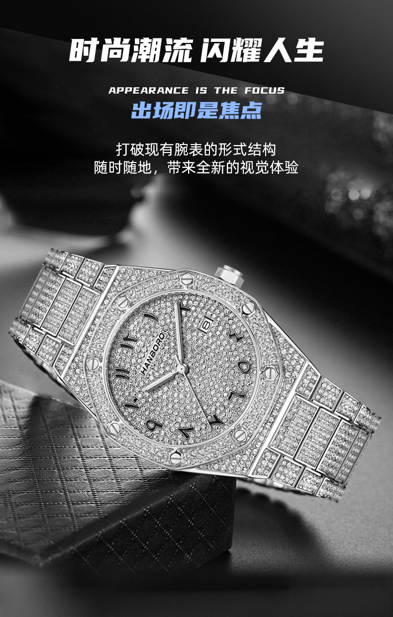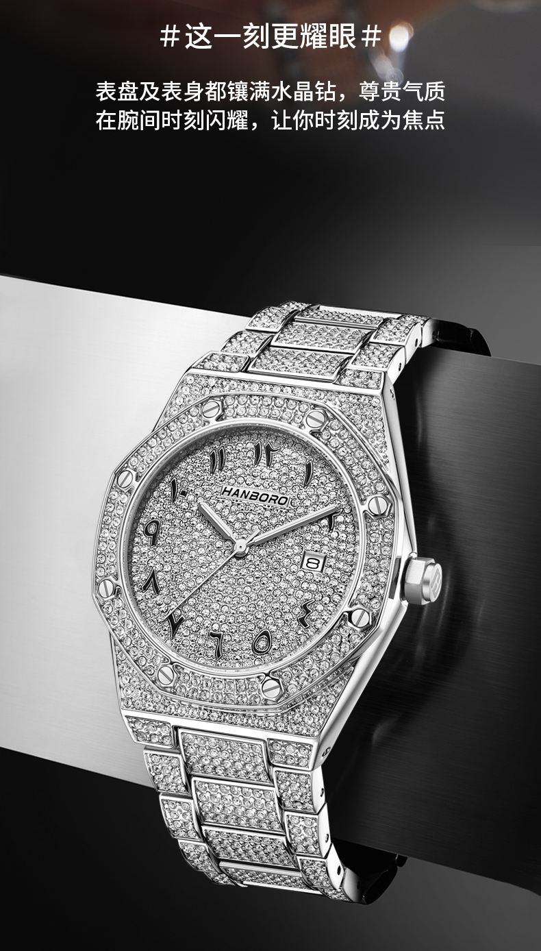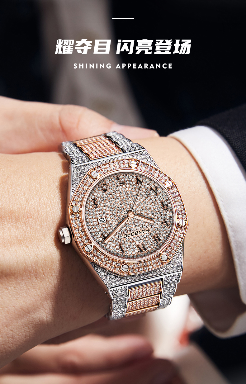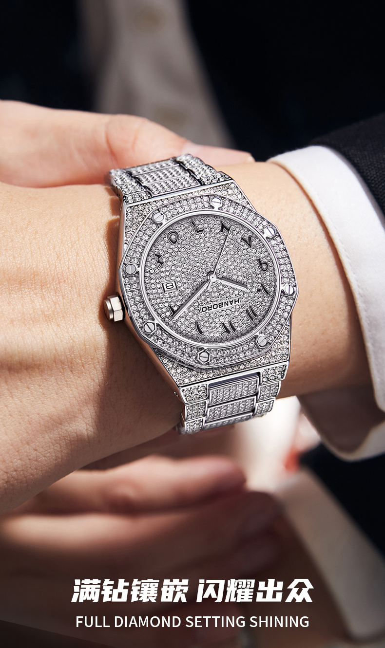 HANBORO Men's Full Star Crystal Diamond Quartz Watch Fashion Trend Watch 384-2