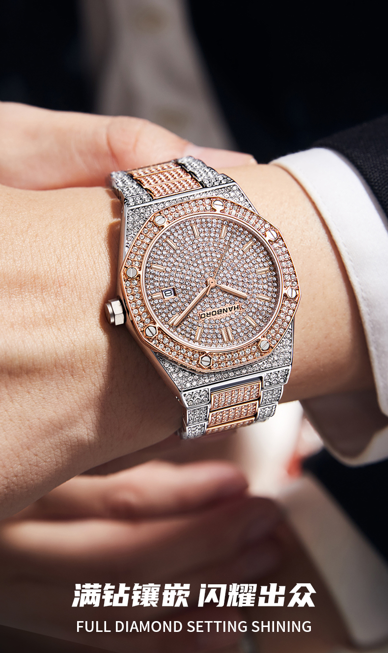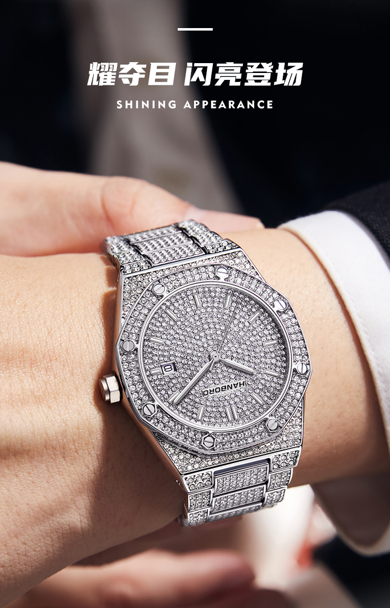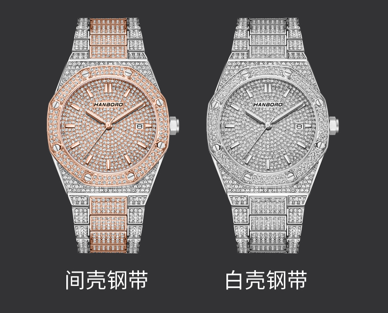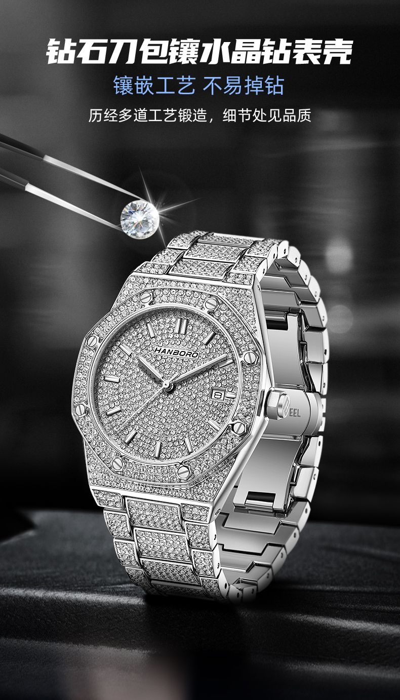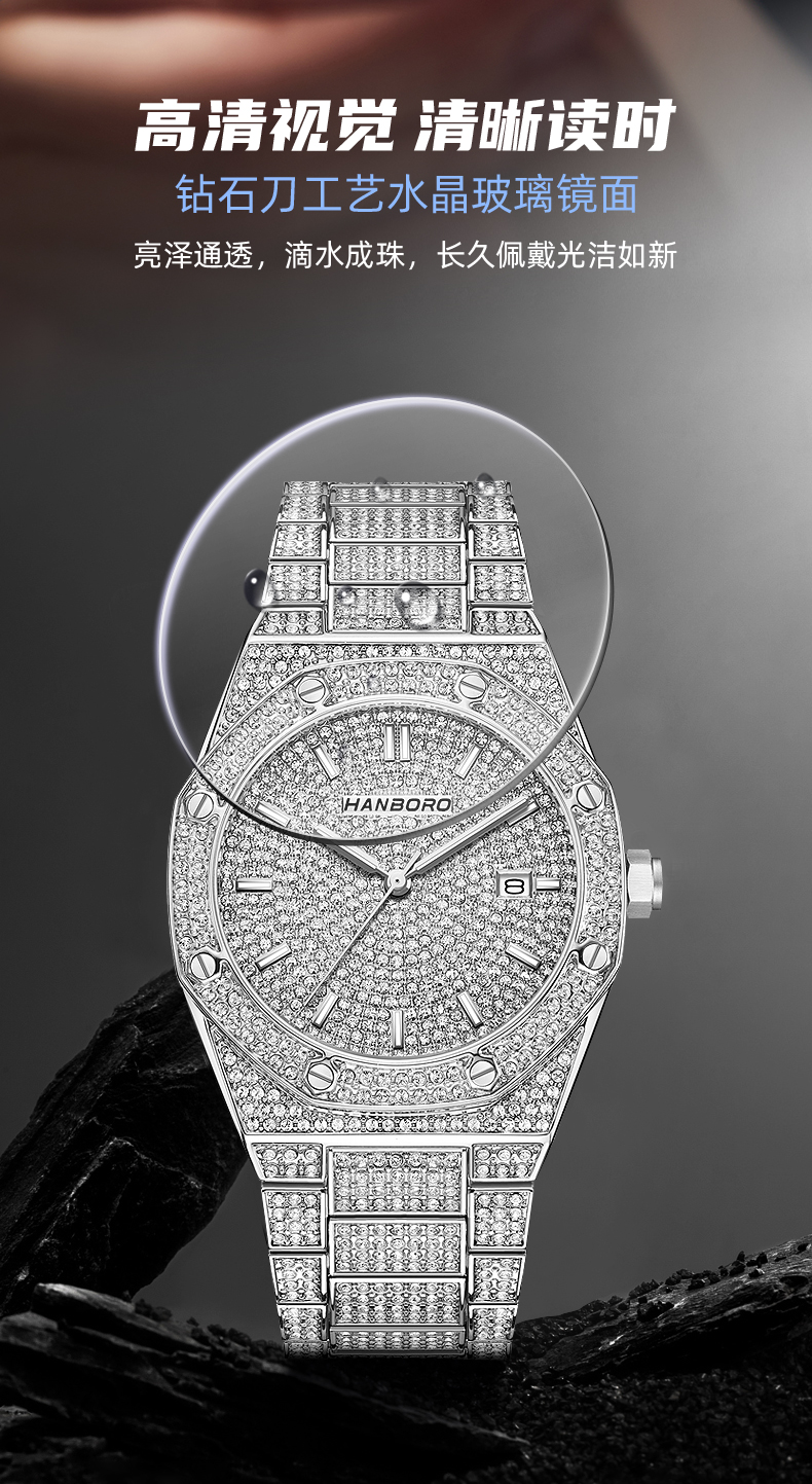 HANBORO Men's Full Star Crystal Diamond Quartz Watch Fashion Trend Watch 384-1
