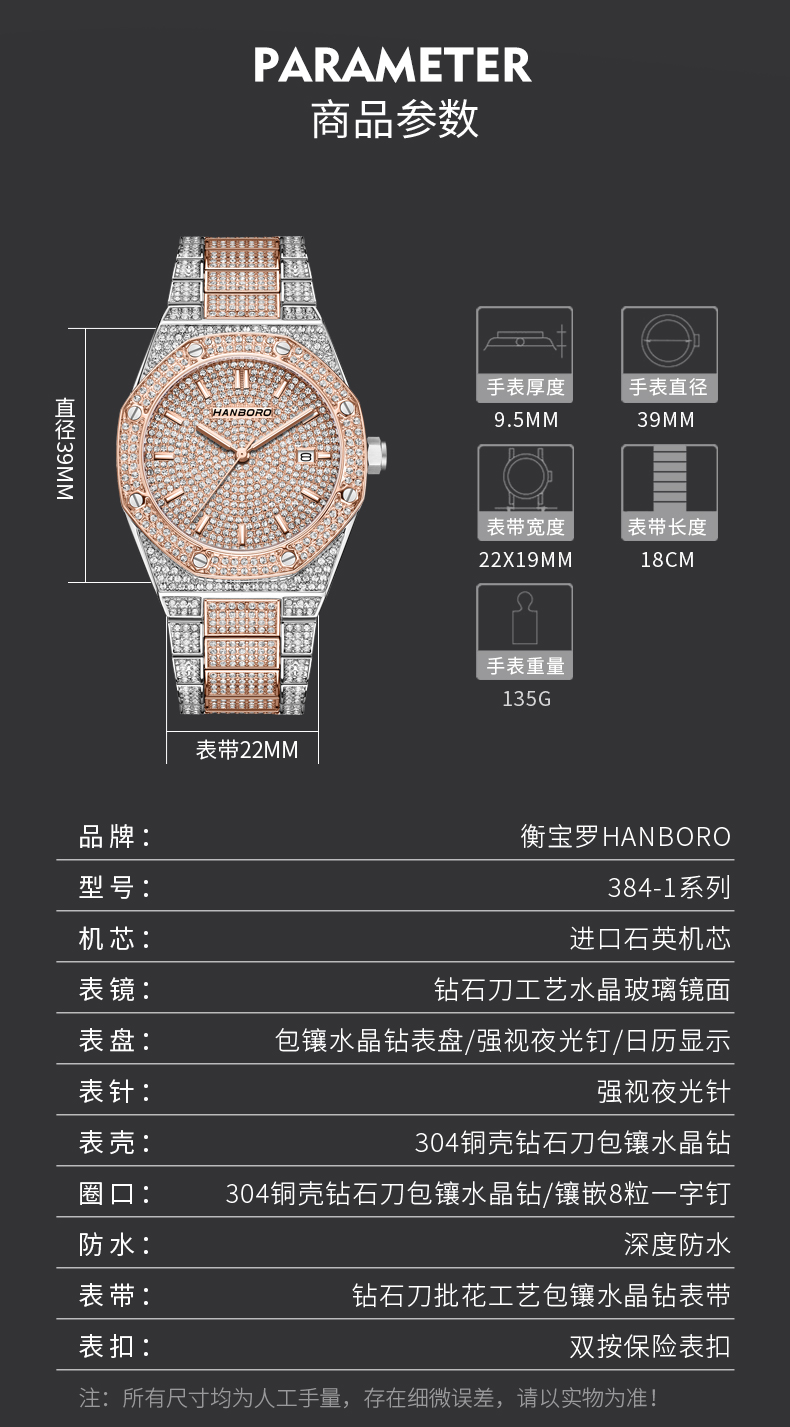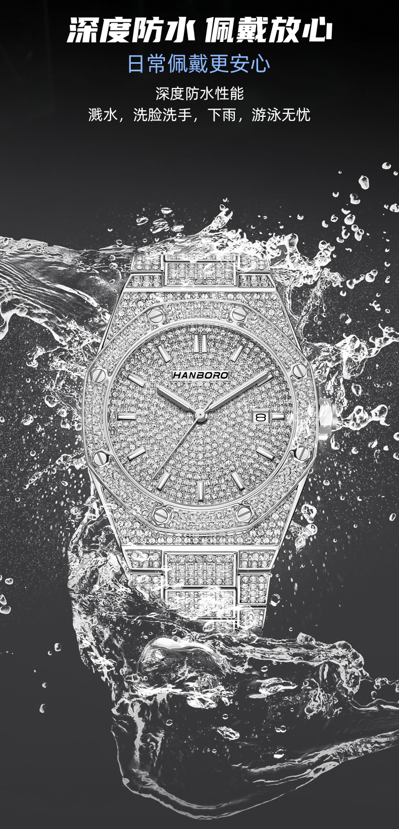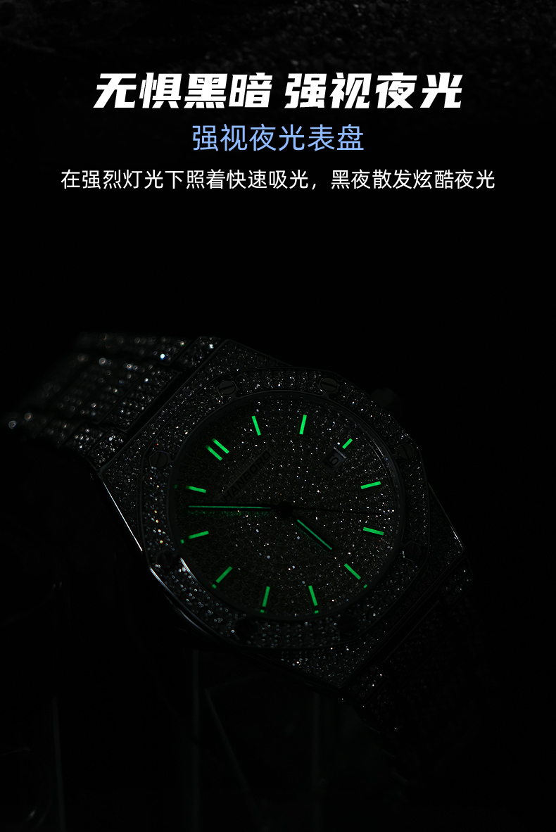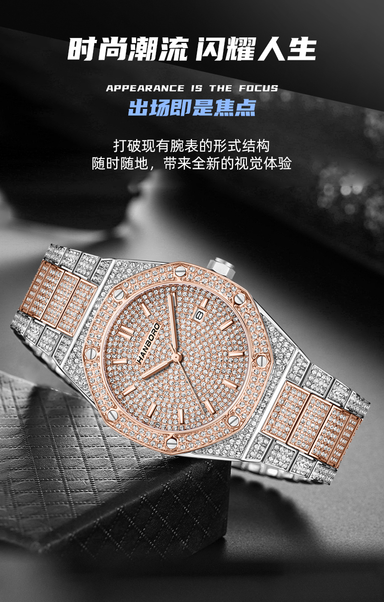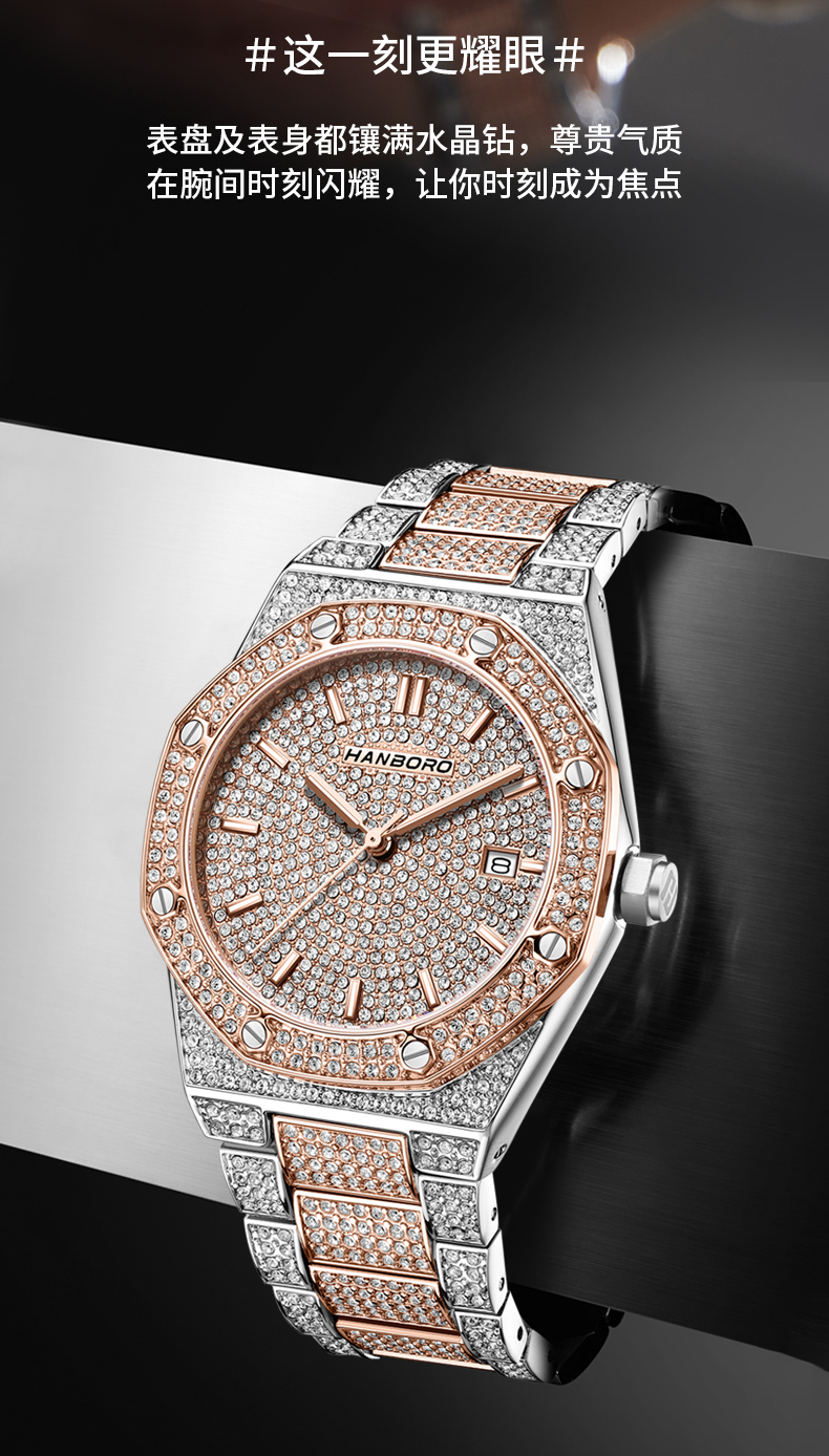 HANBORO Men's Full Star Crystal Diamond Quartz Watch Fashion Trend Watch 384-1