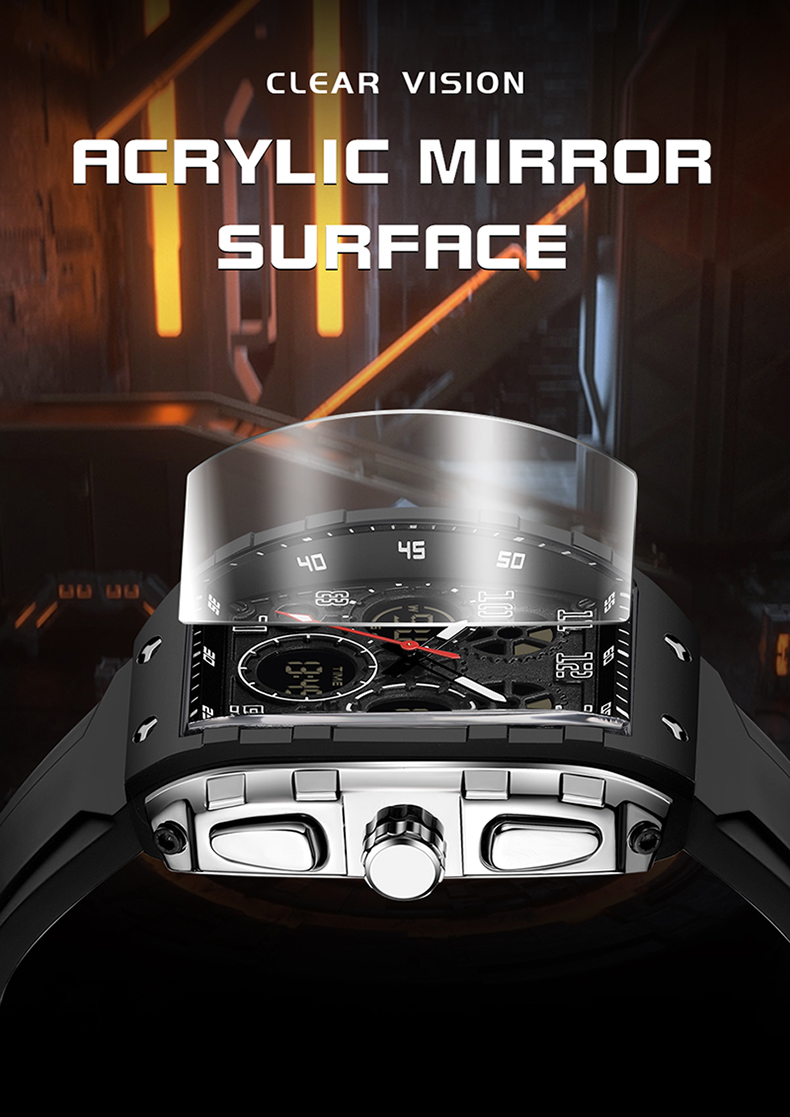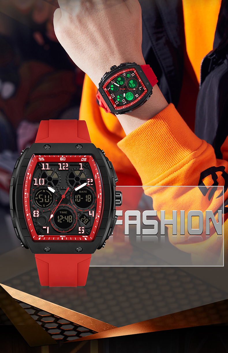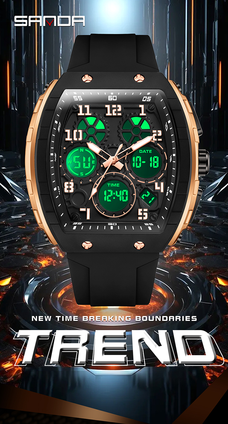 SANDA best selling explosions 6157 barrel multifunctional electronic watch Trendy barrel-shaped shell, double-display dial design, face value and strength coexist! Day, date, time and running seconds are displayed in four windows, which is convenient to see at a glance! A variety of functions can easily meet daily needs: countdown, time between two places, alarm clock and the hour, running seconds, day of the week, 12/24 hour system! Built-in electronic luminous movement, one-button bright screen, with fluorescent pointer, you can still see the time clearly in the dark! 50M depth waterproof, sealed waterproof system, no fear of splashing and getting wet, more comfortable to wear every day! High transparent acrylic mirror, clear mirror, abrasion and scratch resistance! Soft silicone strap, comfortable to wear, not easy to deform and change color! Cross-border platform selling styles, a variety of color choices, suitable for a variety of occasions!