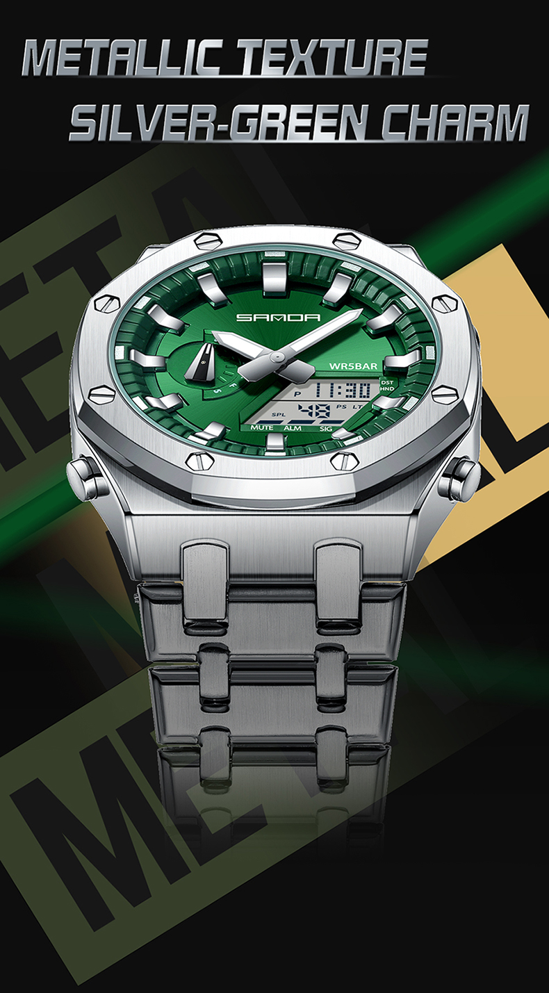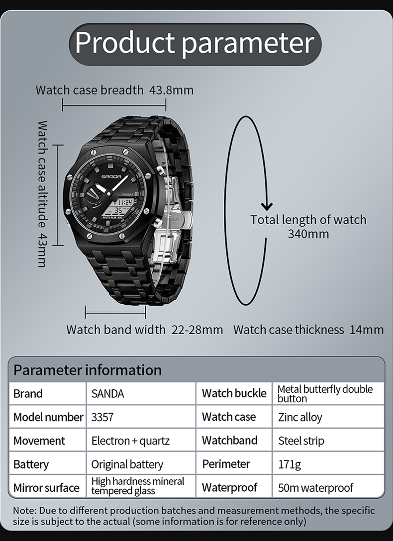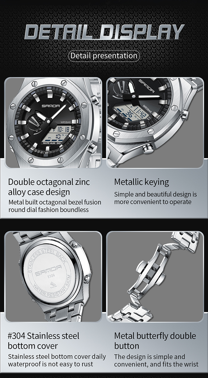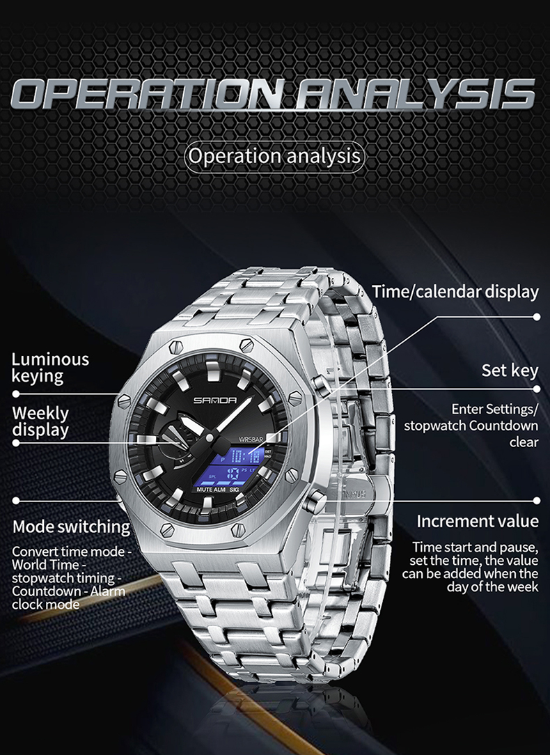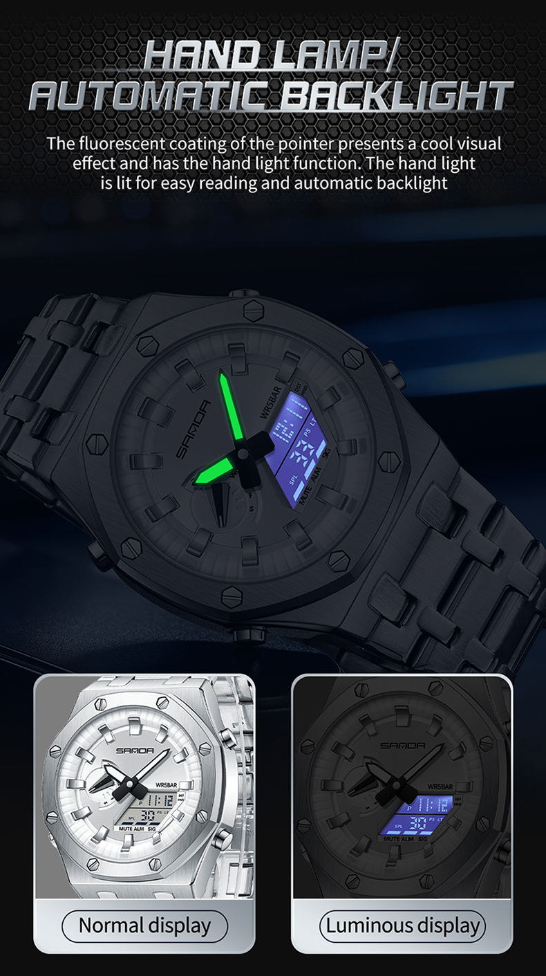 Sanda 3357 synchronous hand lamp multifunctional men's electronic watch Octagonal double display disk, face value strength double online. Backlight+hand lamp function, world time, countdown, daylight saving time, 5 sets of alarm clocks, day of the week, the hour, stopwatch timing, 12/24 hour system, and various practical functions can be easily set to meet daily needs; Bright zinc alloy case, with prominent metallic texture, fashionable atmosphere, synchronous double-display disk surface and three-dimensional nail scale, is rich in layers, convenient to see at a glance; Pointer fluorescence+electronic screen one-button luminous function, in dark environment, still clearly see the time; 50M waterproof performance, easy to deal with daily splash; Classic steel belt with stainless steel double press button, convenient for fastening, fashionable and stylish; Young students and men in the workplace can wear it, and it is suitable for many scenes such as leisure business;
