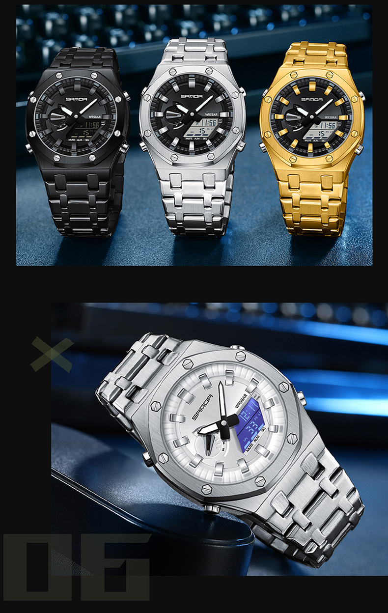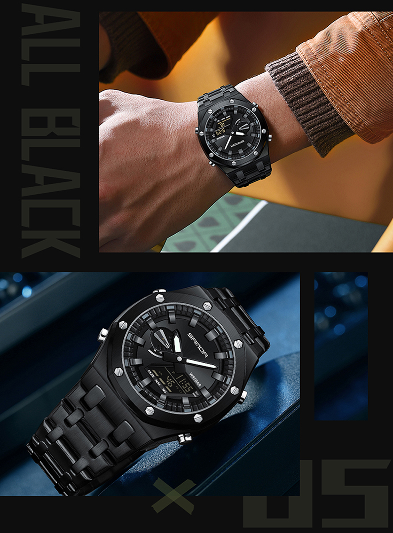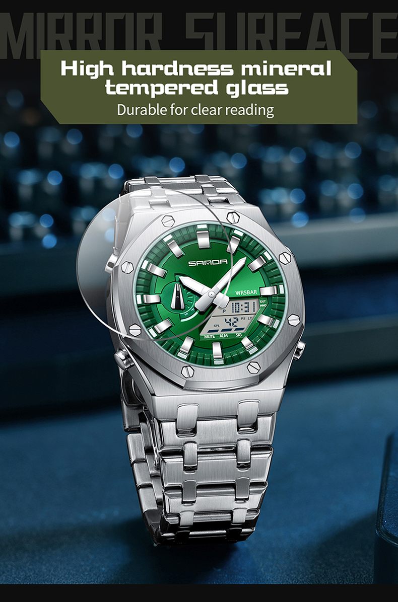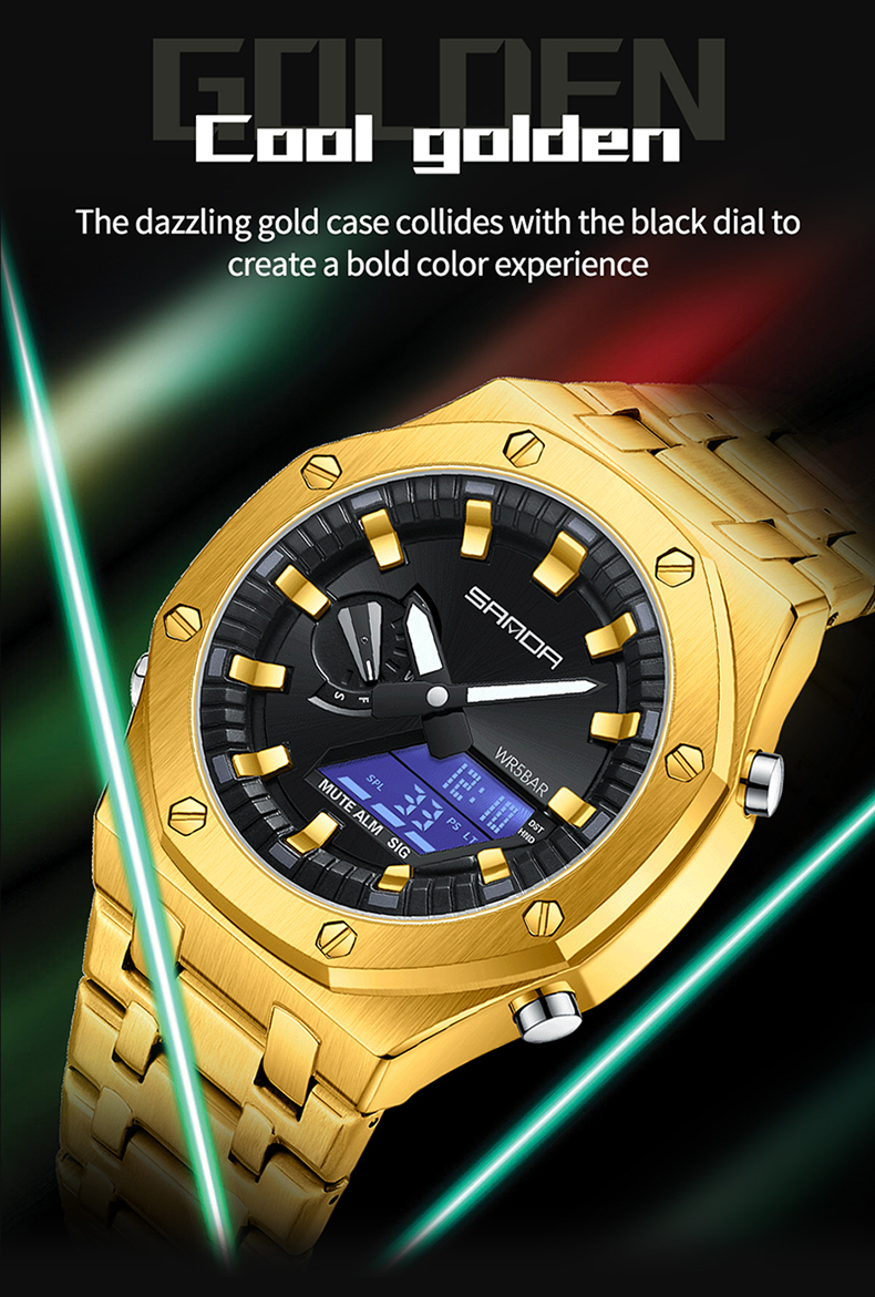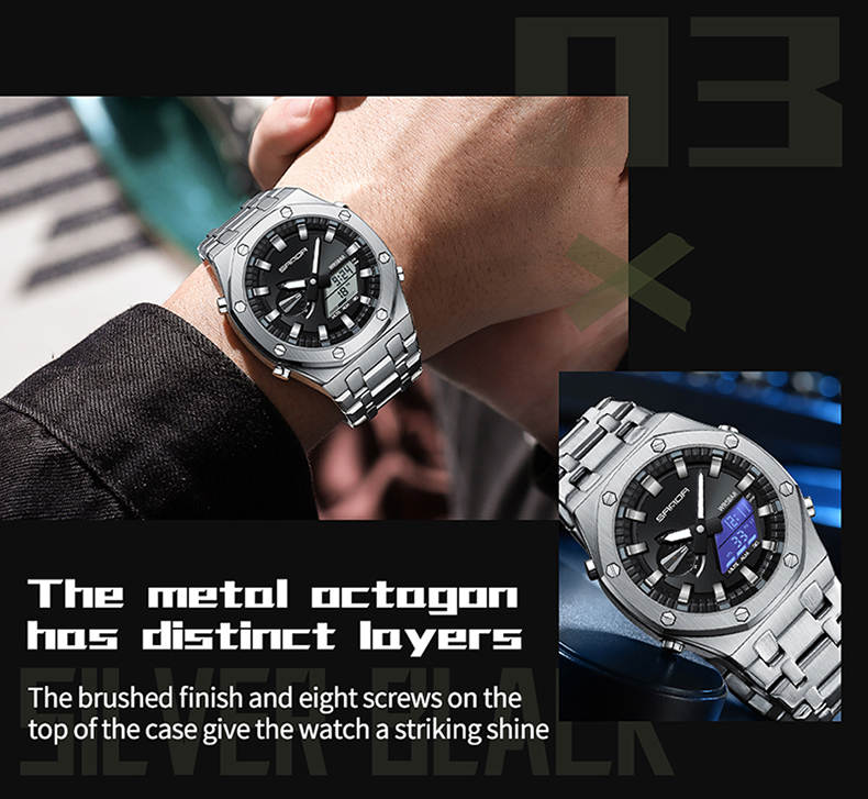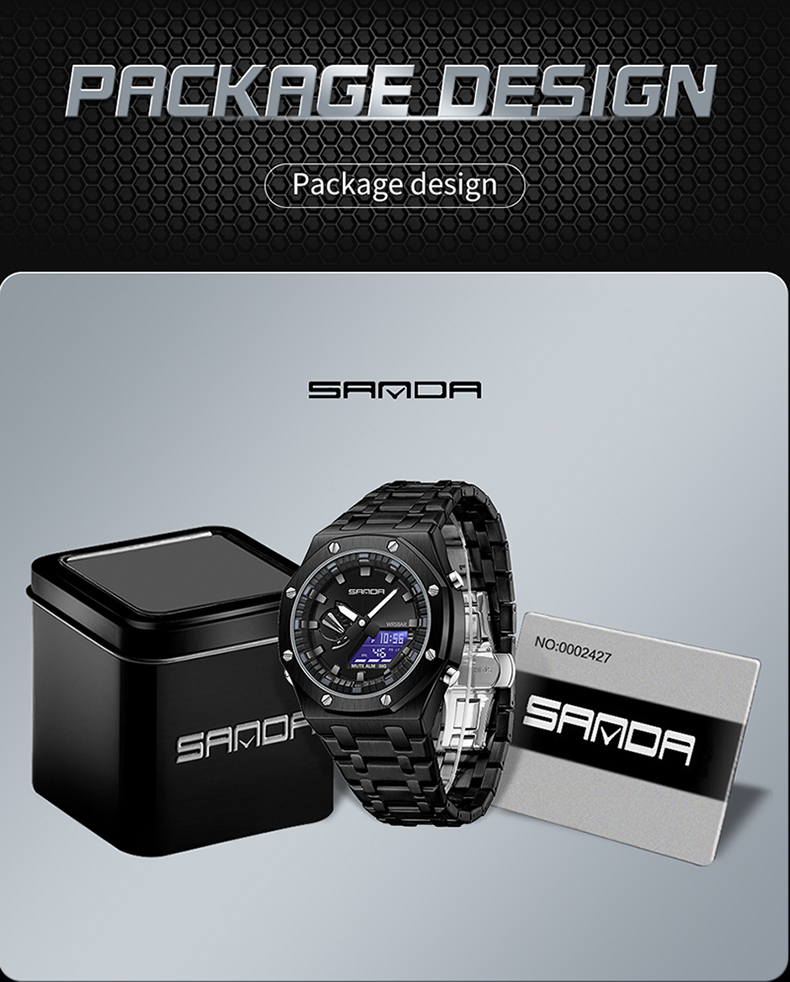 Sanda 3357 synchronous hand lamp multifunctional men's electronic watch Octagonal double display disk, face value strength double online. Backlight+hand lamp function, world time, countdown, daylight saving time, 5 sets of alarm clocks, day of the week, the hour, stopwatch timing, 12/24 hour system, and various practical functions can be easily set to meet daily needs; Bright zinc alloy case, with prominent metallic texture, fashionable atmosphere, synchronous double-display disk surface and three-dimensional nail scale, is rich in layers, convenient to see at a glance; Pointer fluorescence+electronic screen one-button luminous function, in dark environment, still clearly see the time; 50M waterproof performance, easy to deal with daily splash; Classic steel belt with stainless steel double press button, convenient for fastening, fashionable and stylish; Young students and men in the workplace can wear it, and it is suitable for many scenes such as leisure business;