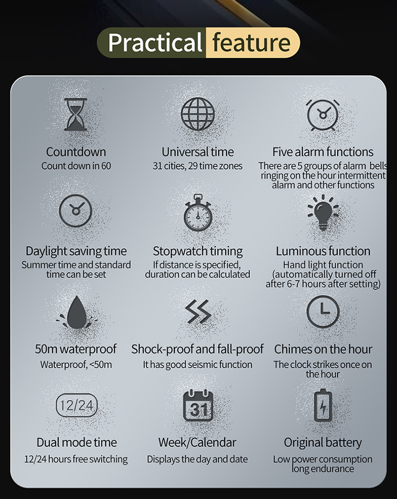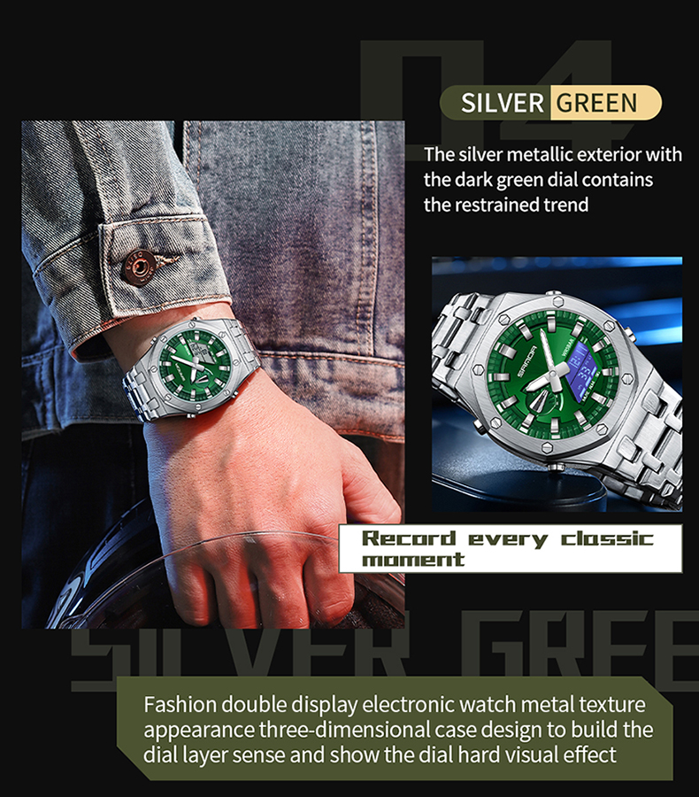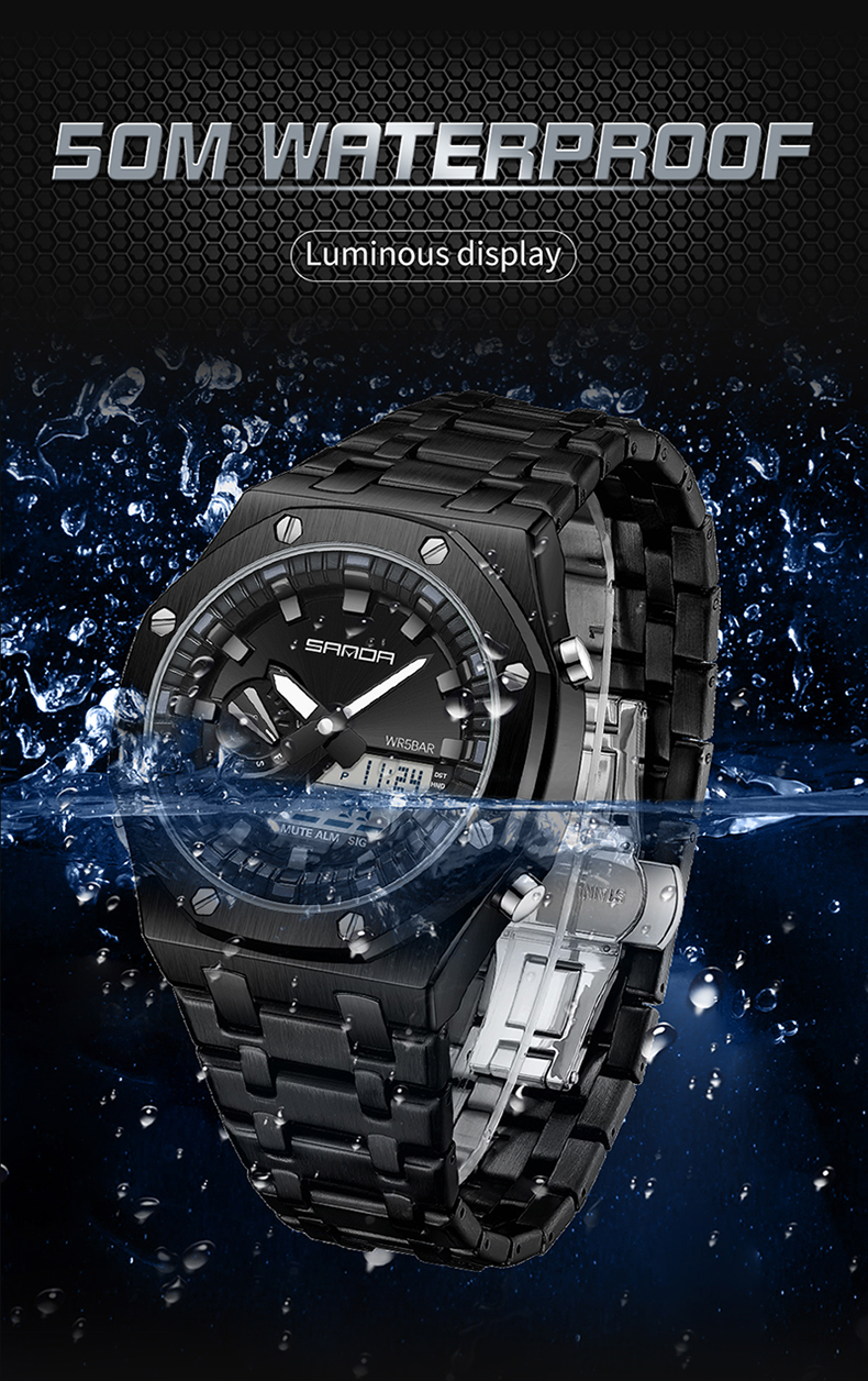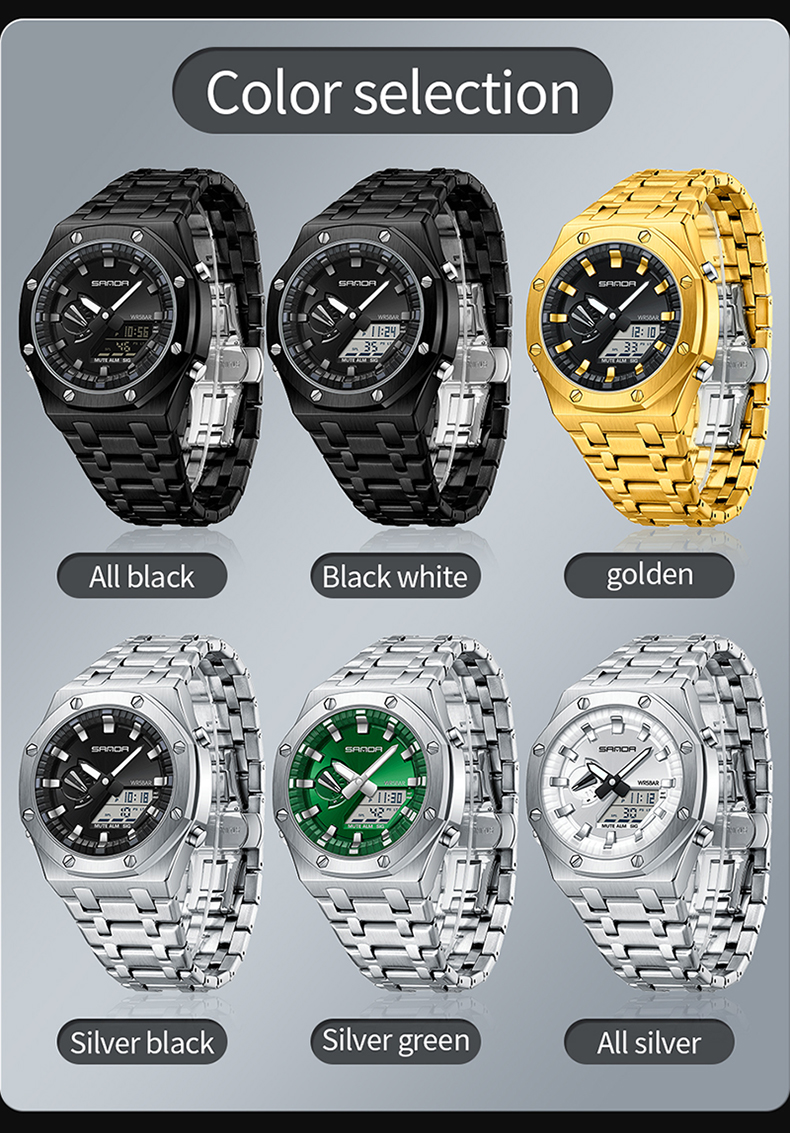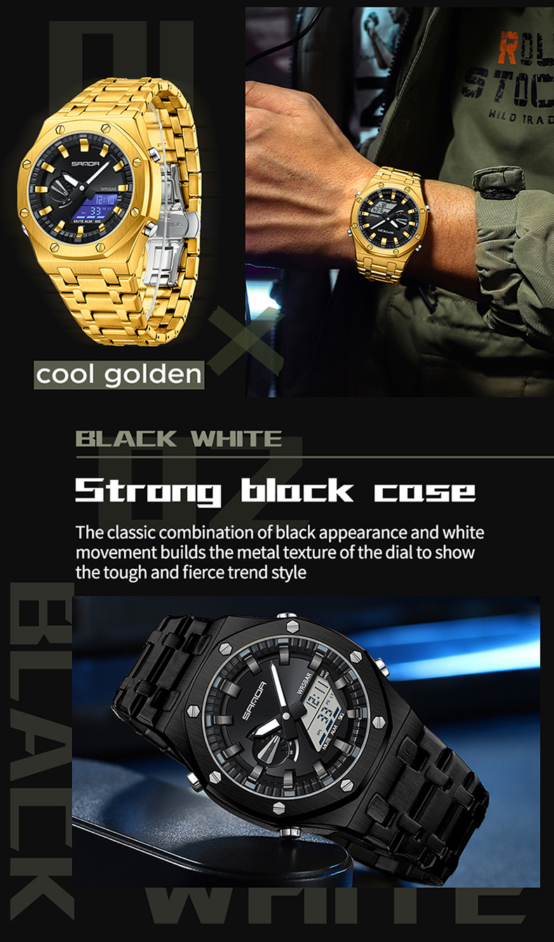 Sanda 3357 synchronous hand lamp multifunctional men's electronic watch Octagonal double display disk, face value strength double online. Backlight+hand lamp function, world time, countdown, daylight saving time, 5 sets of alarm clocks, day of the week, the hour, stopwatch timing, 12/24 hour system, and various practical functions can be easily set to meet daily needs; Bright zinc alloy case, with prominent metallic texture, fashionable atmosphere, synchronous double-display disk surface and three-dimensional nail scale, is rich in layers, convenient to see at a glance; Pointer fluorescence+electronic screen one-button luminous function, in dark environment, still clearly see the time; 50M waterproof performance, easy to deal with daily splash; Classic steel belt with stainless steel double press button, convenient for fastening, fashionable and stylish; Young students and men in the workplace can wear it, and it is suitable for many scenes such as leisure business;