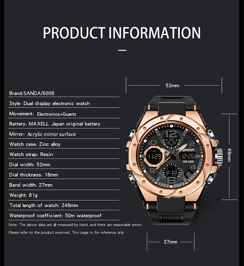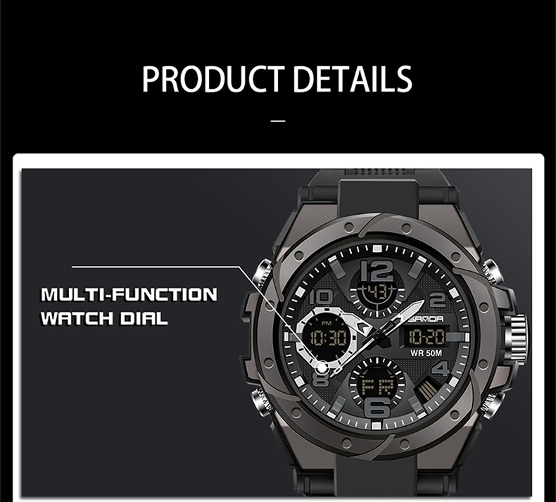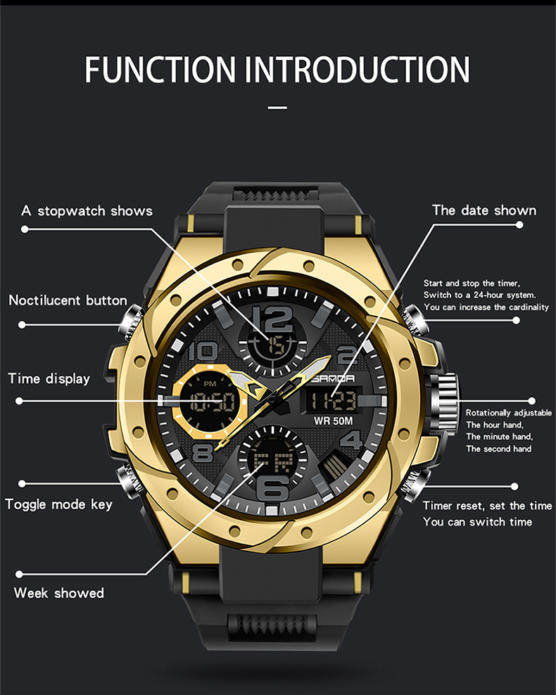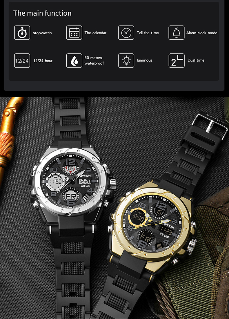 Sanda best-selling explosions-6008 multifunctional sports student watches ! Fashion explosions, new upgrades and new lighting! 1, pointer fluorescent coating+one-button bright screen design, newly upgraded lighting brightness, brighter screen, clearer when seen in the dark! 2. Built-in electronic+Shi Ying movement, MAXELL imported battery, which is stable in walking time and long in battery life; 3. It integrates a variety of practical functions: hourly time, stopwatch timing, week calendar, alarm clock mode, 12/24-hour system; 4, 30M life waterproof performance, no fear of getting wet by daily splash; 5, acrylic mirror, clear when reading, wear-resistant and scratch-resistant; 6, TPU strap, comfortable to wear, not easy to deform and change color; 7, Sanda brand selling explosions, stable wholesale/retail payment! This can be customized LOGO processing!