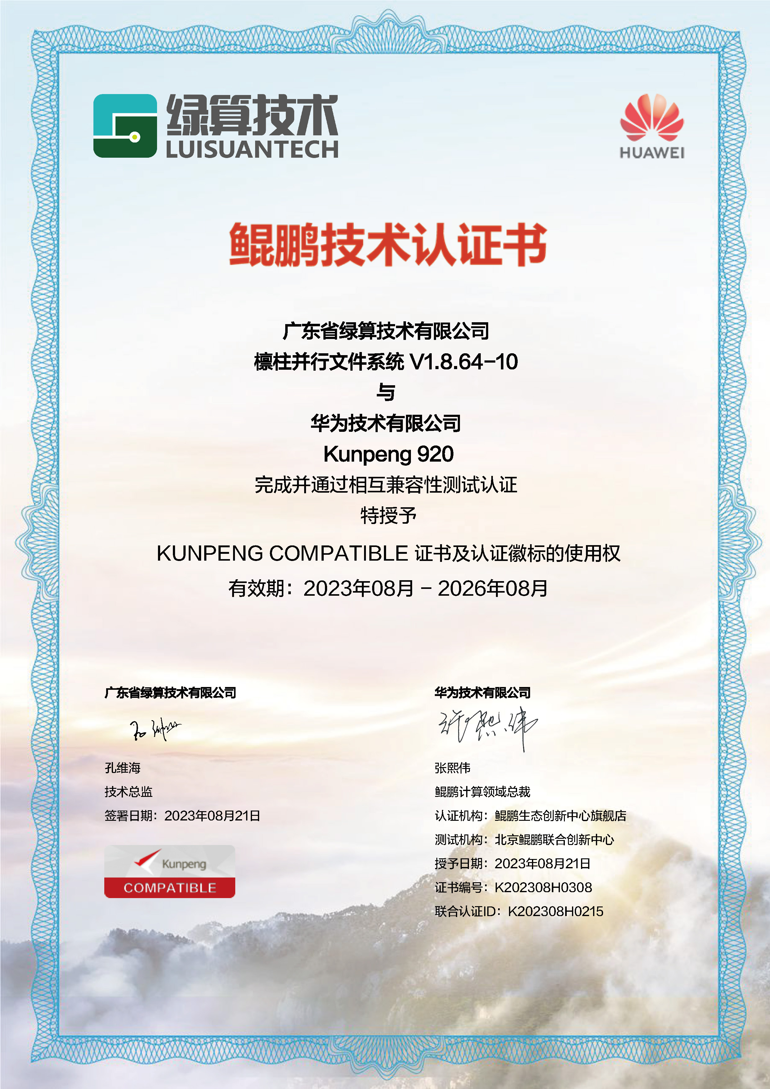 Certification of KUNPENG COMPATIBLE (Compatibility with LUISUAN V1.8.64-10) )