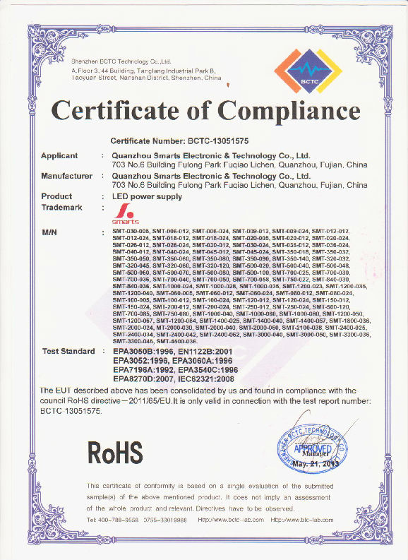 ROHS certificate for enclosure power supply